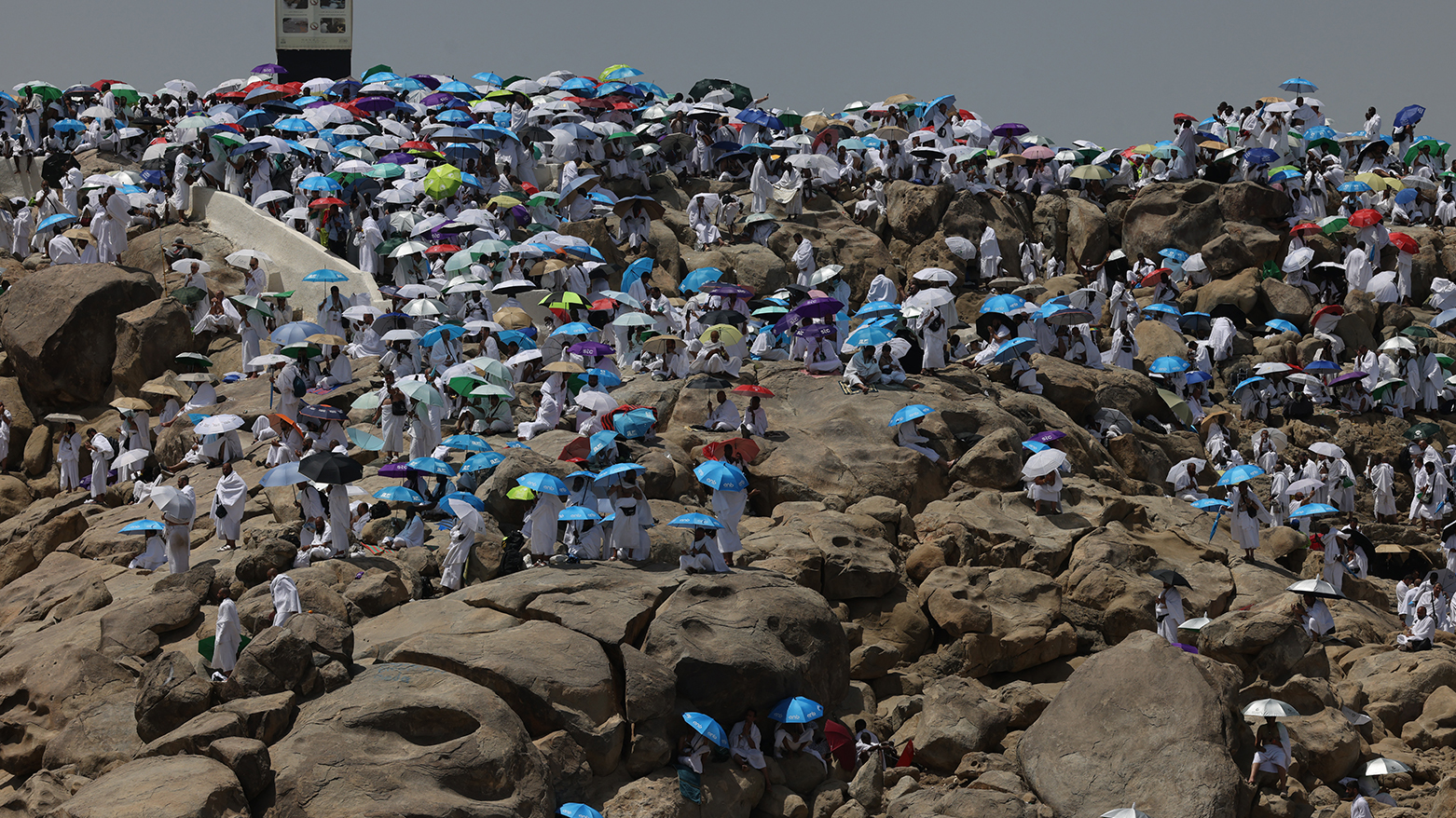 ورغم الحر الشديد وتحذيرات السلطات بعدم التعرّض للشمس مباشرة خلال ساعات الذروة، تحدّى بعض الحجّاج الحرارة وصعدوا جبل عرفات أو تجمّعوا عند سفحه، فيما حملت غالبيتهم مظلات ملوّنة.