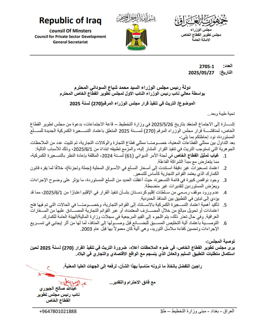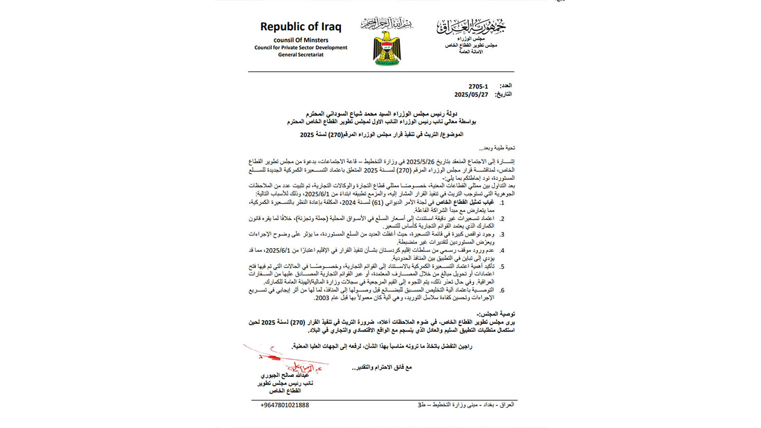 وأوصى مجلس تطوير القطاع الخاص رئاسة مجلس الوزراء العراقي، "انه في ضوء الملاحظات أعلاه، نرى ضرورة التريث في تنفيذ القرار 207 لسنة 2025 لحين استكمال متطلبات التطبيق السليم والعادل الذي ينسجم مع الواقع الاقتصادي والتجاري في البلاد.
