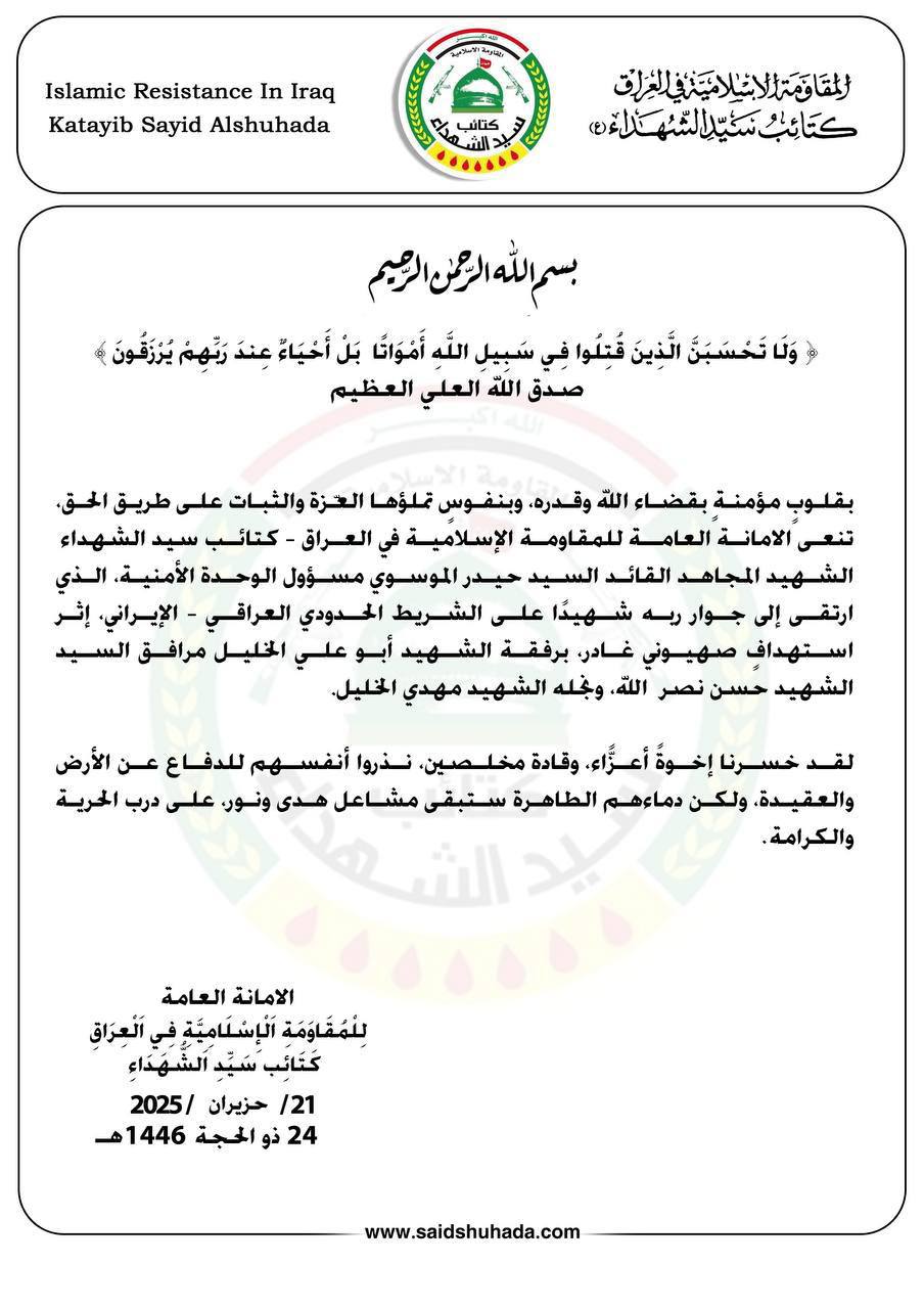 وقالت الأمانة العامة "للمقاومة الإسلامية في العراق"، في بيان اطلعت عليه كوردستان24، "بقلوب مؤمنة بقضاء الله وقدره، وبنفوس تملؤها العزة والثبات على طريق الحق، تنعى الأمانة العامة، للمقاومة الإسلامية في العراق - كتائب سيد الشهداء الشهيد المجاهد القائد السيد حيدر الموسوي مسؤول الوحدة الأمنية، الذي ارتقى إلى جوار ربه شهيداً على الشريط الحدودي العراقي - الإيراني، إثر استهداف صهيوني غادر، برفقة الشهيد أبو علي الخليل مرافق السيد الشهيد حسن نصر الله، ونجله الشهيد مهدي الخليل".