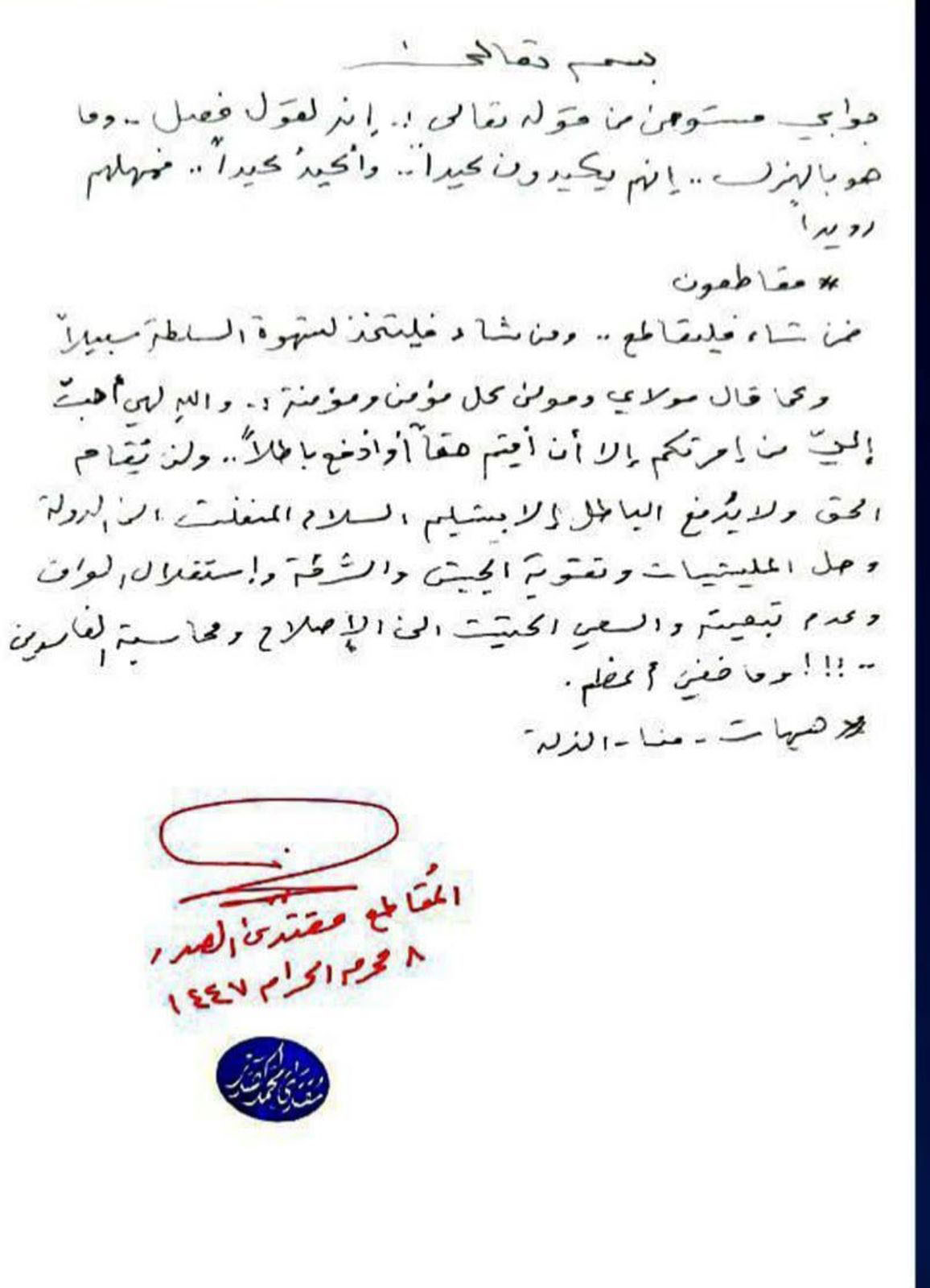 واختتم الصدر بيانه بعبارة تحذيرية قائلاً، "وما خفي أعظم".
