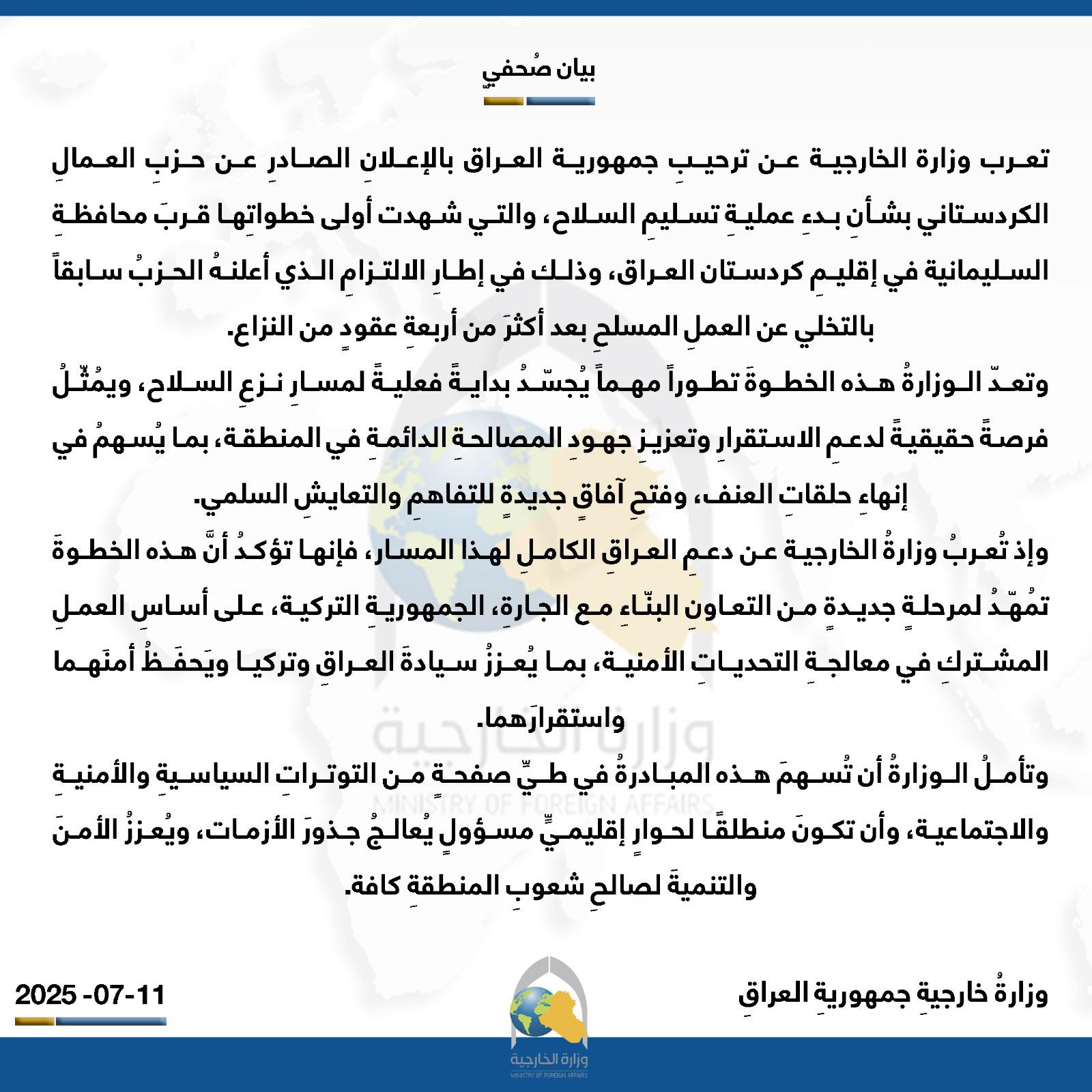 أربيل (كوردستان 24)- رحّبت وزارة الخارجية العراقية بالإعلانِ الصادر عن حزب العمال الكوردستاني بشأن بدء عملية تسليم السلاح، معلنةً دعم العراق الكامل لهذا المسار.