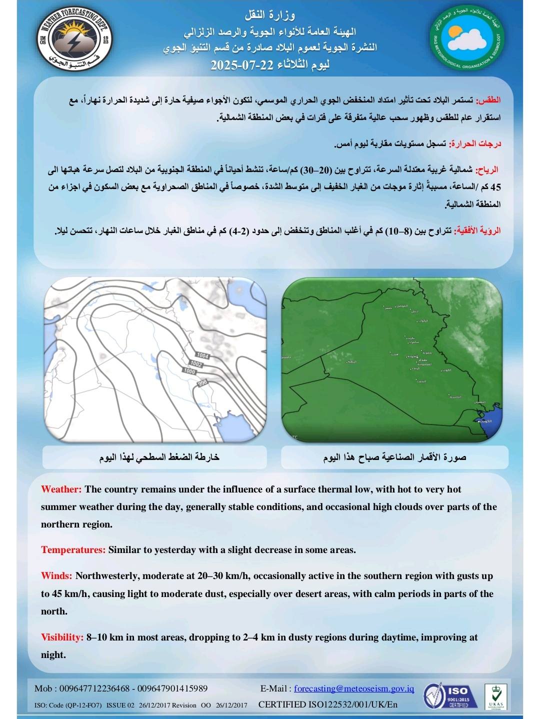 وذكر بيان للهيئة العامة للانواء الجوية والرصد الزلزالي قسم التنبؤ الجوي اليوم الثلاثاء 22 تموز 2025، أن "الطقس ليوم غد الاربعاء سيكون صحواً مع بعض الغيوم في المنطقة الجنوبية، ودرجات الحرارة ترتفع قليلاً عن اليوم السابق في عموم البلاد"، مبيناً أن"درجات الحرارة العظمى ستكون في بغداد وديالى وبابل وصلاح الدين والديوانية 47 ، وواسط وكربلاء المقدسة والنجف الاشرف والمثنى 48، ودهوك 43، سليمانية واربيل44، نينوى وكركوك 46 ، والانبار45، والناصرية 49 ، وميسان والبصرة 50".