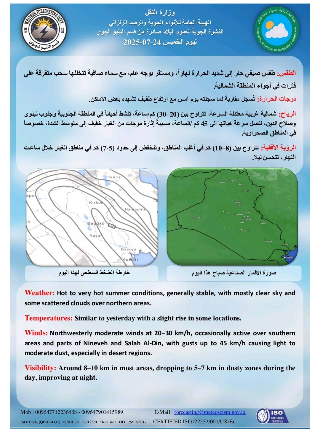 وذكر بيان للهيئة العامة للانواء الجوية والرصد الزلزالي قسم التنبؤ الجوي اليوم الخميس 24 تموز 2025، أن "غداً الجمعة سيكون الطقس صحواً مع بعض الغيوم، ودرجات الحرارة مقاربة لليوم السابق في عموم البلاد".