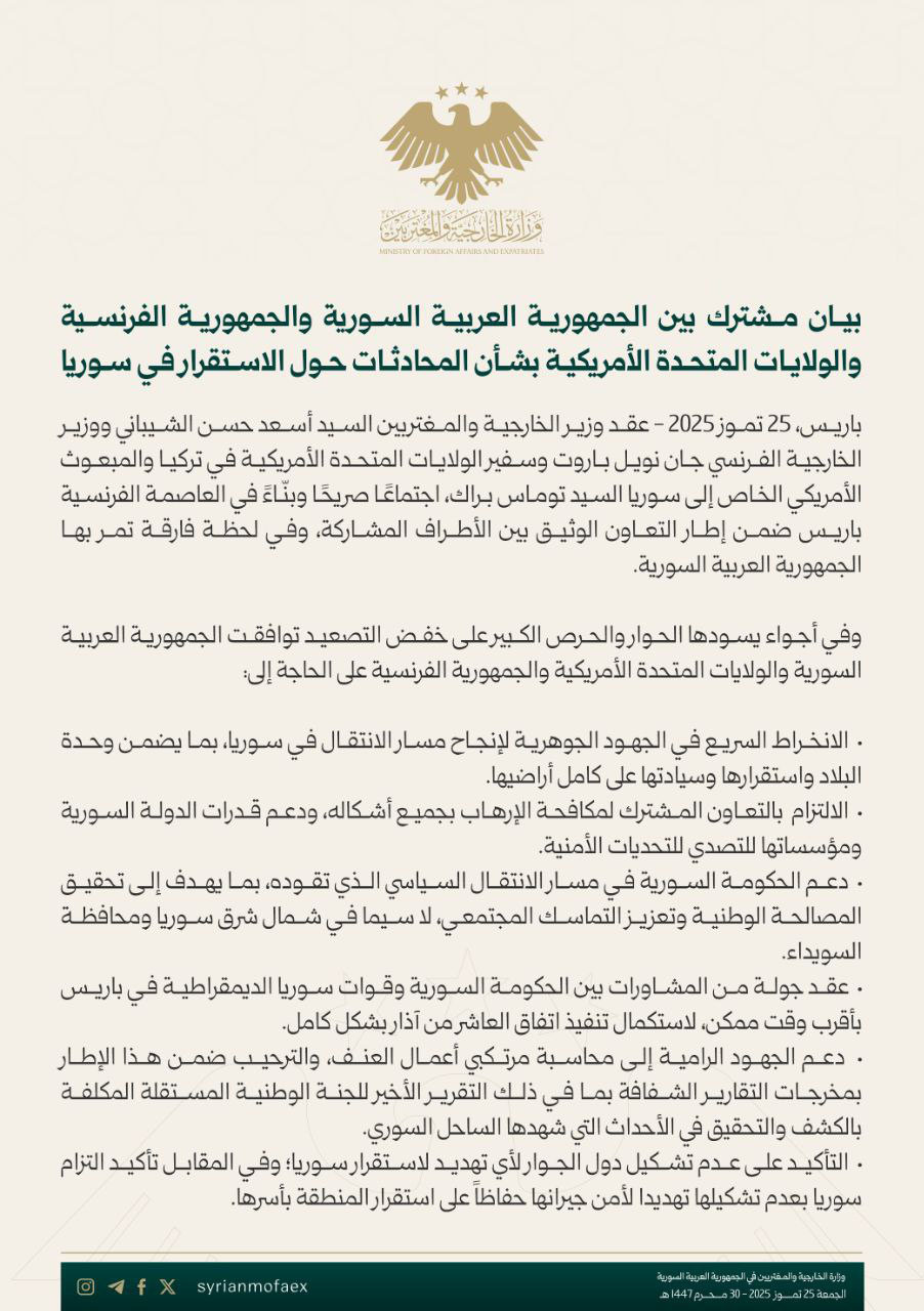 وشدد البيان المشترك على الانخراط السريع في الجهود الجوهرية لانجاح مسار الانتقال في سوريا بما يضمن وحدة البلاد واستقرارها وسيادتها على كامل اراضيها.