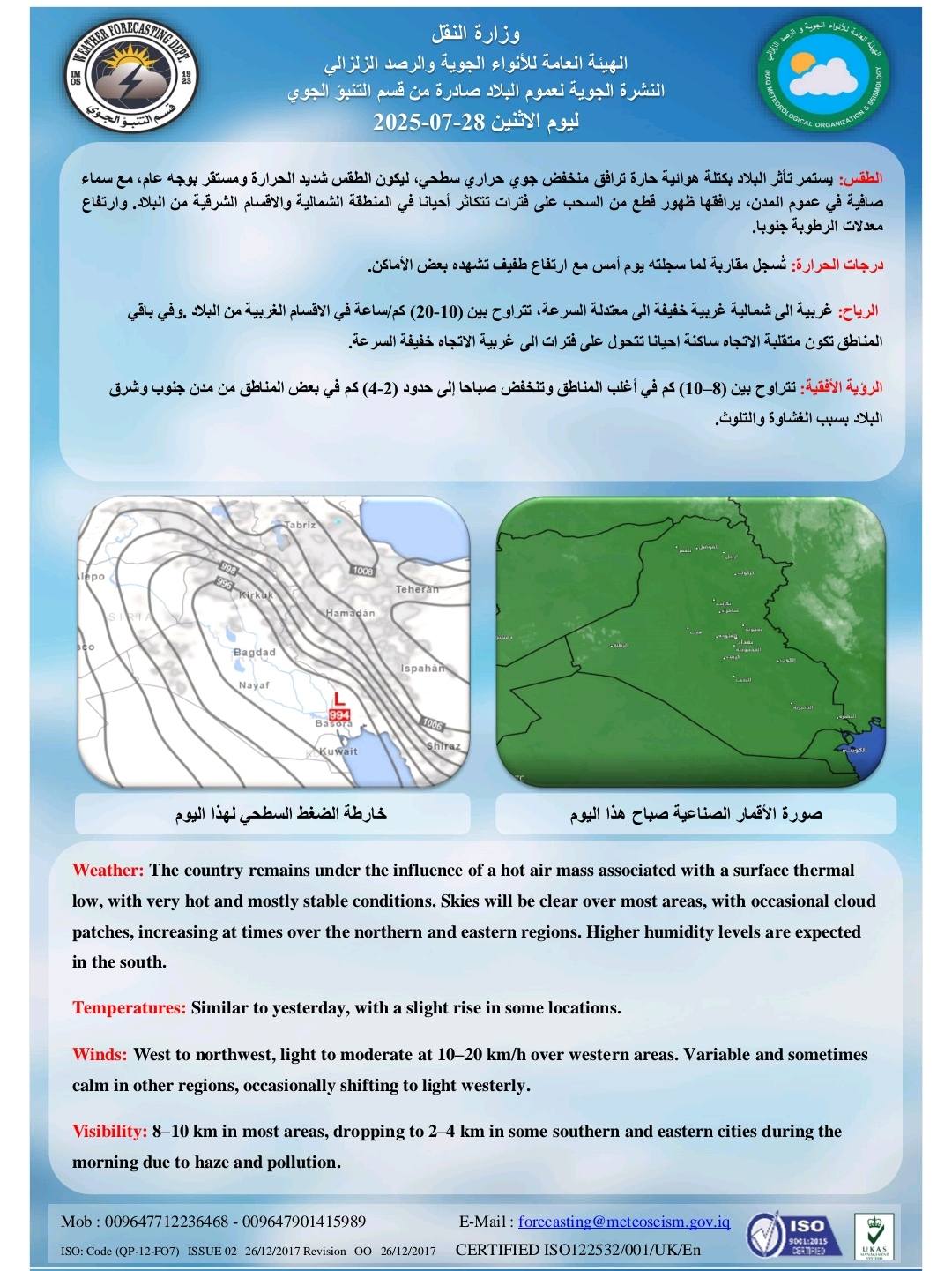 وذكر بيان للهيئة العامة للانواء الجوية والرصد الزلزالي قسم التنبؤ الجوي اليوم الاثنين 28 تموز 2025، أن "الطقس ليوم غد الثلاثاء سيكون صحواً وحاراً مع بعض الغيوم في المنطقة الشمالية، والرياح شمالية غربية معتدلة السرعة، ودرجات الحرارة تنخفض قليلاً في المنطقة الوسطى ومقاربة لليوم السابق في المنطقتين الجنوبية والشمالي".