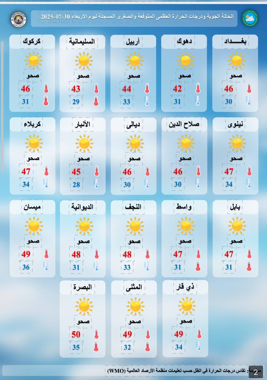 وأضاف أن "درجات الحرارة العظمى ليوم غدٍ الخميس، كالتالي: بغداد وديالى وكركوك 45، السليمانية وأربيل والأنبار 44، كربلاء المقدسة ونينوى وبابل وواسط 46، البصرة 50".