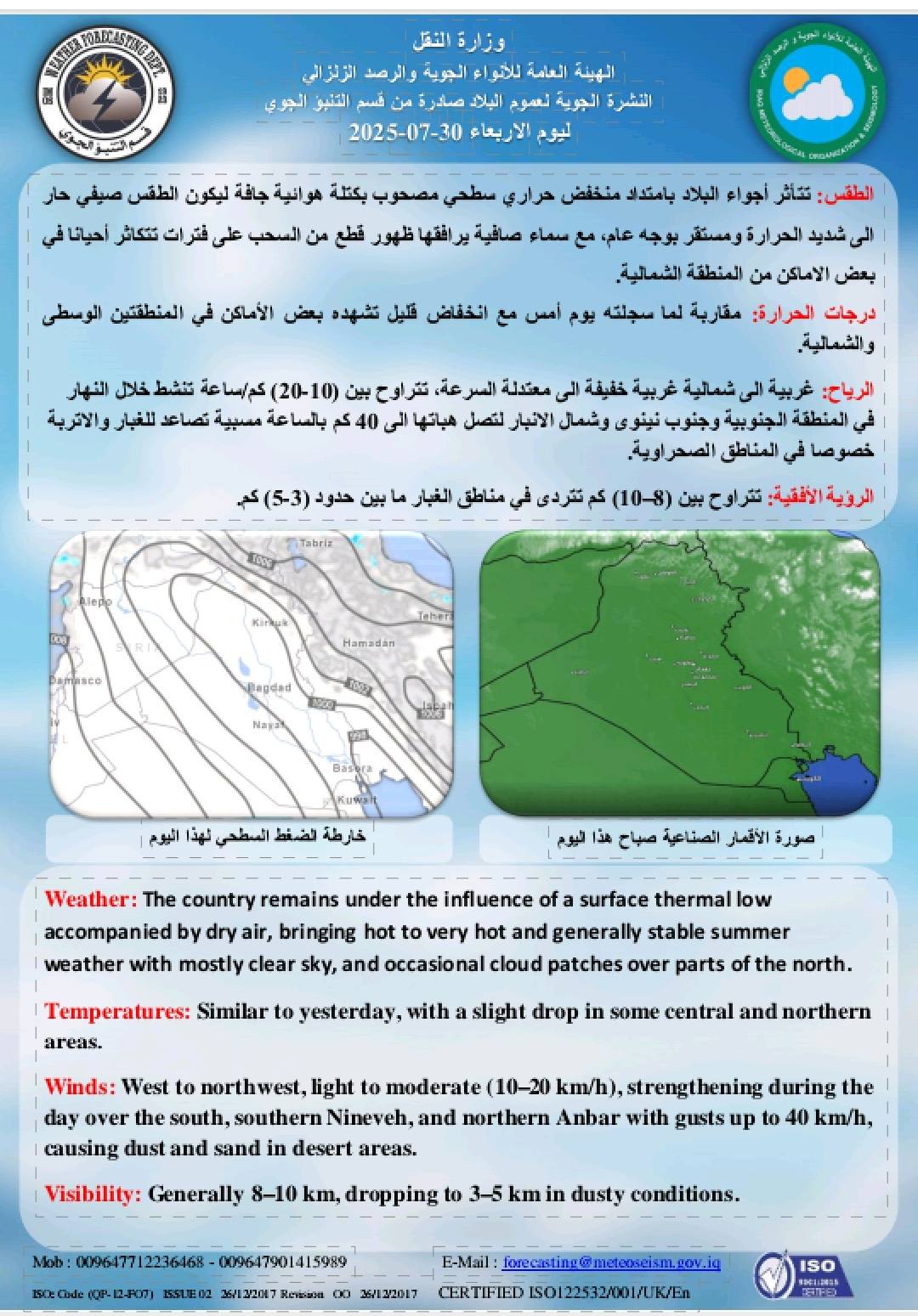 وقال بيان للهيئة العامة للانواء الجوية والرصد الزلزالي قسم التنبؤ الجوي اليوم الاربعاء 30 تموز 2025، أن "غداً الخميس سيكون الطقس صحواً، ويكون غائماً جزئياً في الأقسام الشرقية من المنطقة الشمالية مع تصاعد الغبار في المنطقتين الوسطى والشمالية، ودرجات الحرارة تنخفض قليلاً في المنطقتين الوسطى والجنوبية ومقاربة في المنطقة الشمالية، الرؤية الأفقية (8-10)كم وفي الغبار (3-5)كم".