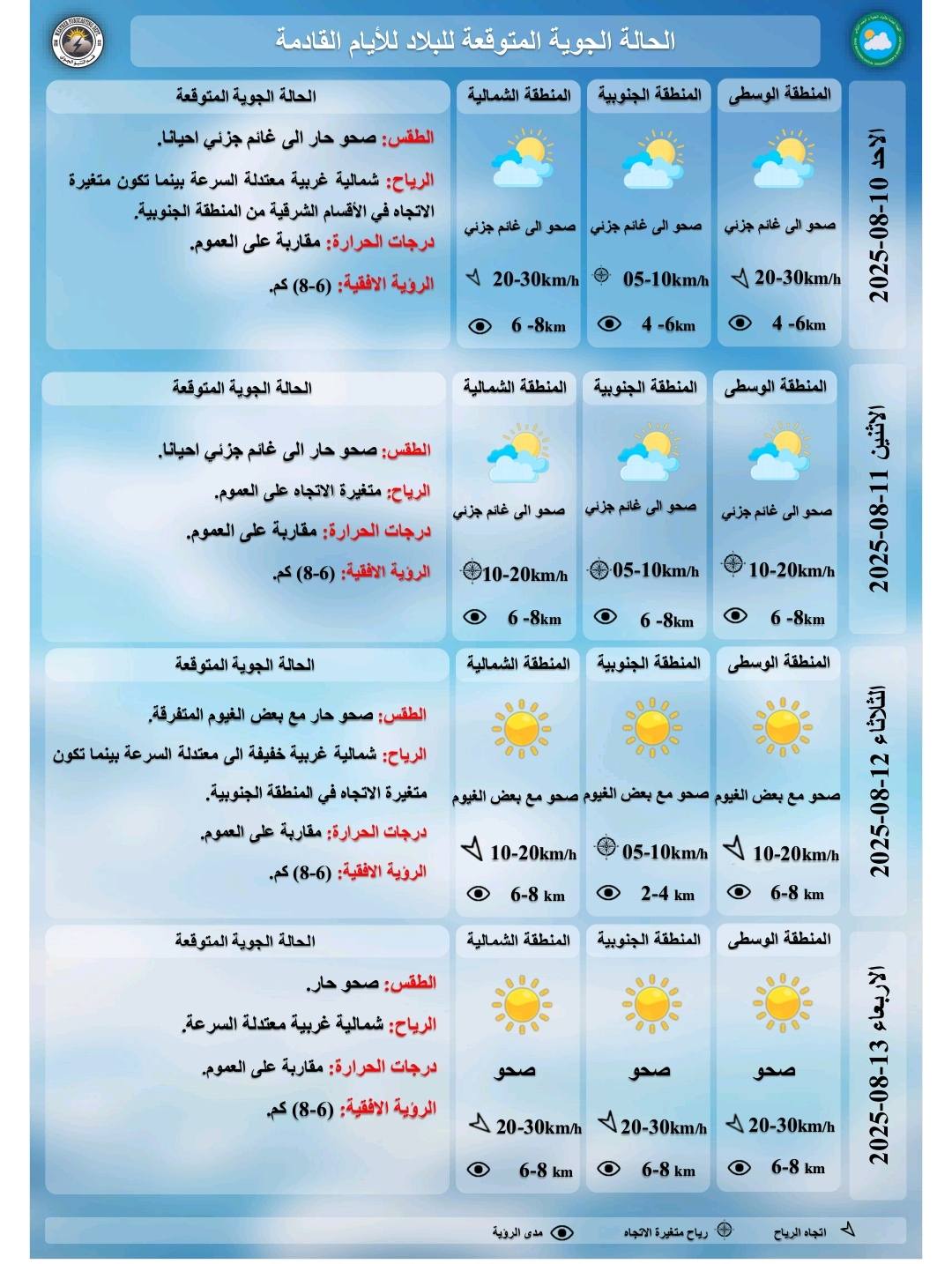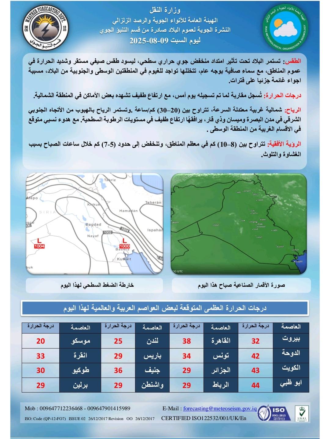 وقالت الهيئة العامة للانواء الجوية والرصد الزلزالي قسم التنبؤ الجوي في بيان لها اليوم السبت 9 آب 2025، أن "غداً الأحد سيكون الطقس صحواً وحاراً إلى غائم جزئي، ودرجات الحرارة مقاربة لليوم السابق"، مشيراً الى أن "درجات الحرارة العظمى في مختلف محافظات العراق ليوم غدٍ الأحد، كالتالي: بغداد وكربلاء المقدسة وواسط والمثنى وميسان والبصرة 50، دهوك والسليمانية 43، أربيل 45، نينوى 47، صلاح الدين والأنبار وكركوك 48، وديالى وبابل والديوانية والنجف الأشرف 49، وذي قار 51".