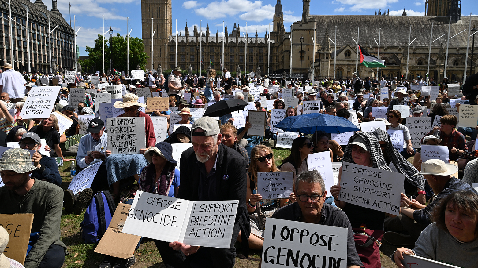 تجمّع المحتجون قرب مبنى البرلمان منذ الظهيرة، حاملين لافتات كتب عليها "عارضوا الإبادة، ادعموا مجموعة فلسطين أكشن"، إلى جانب شعارات أخرى، بينما لوّحوا بالأعلام الفلسطينية.