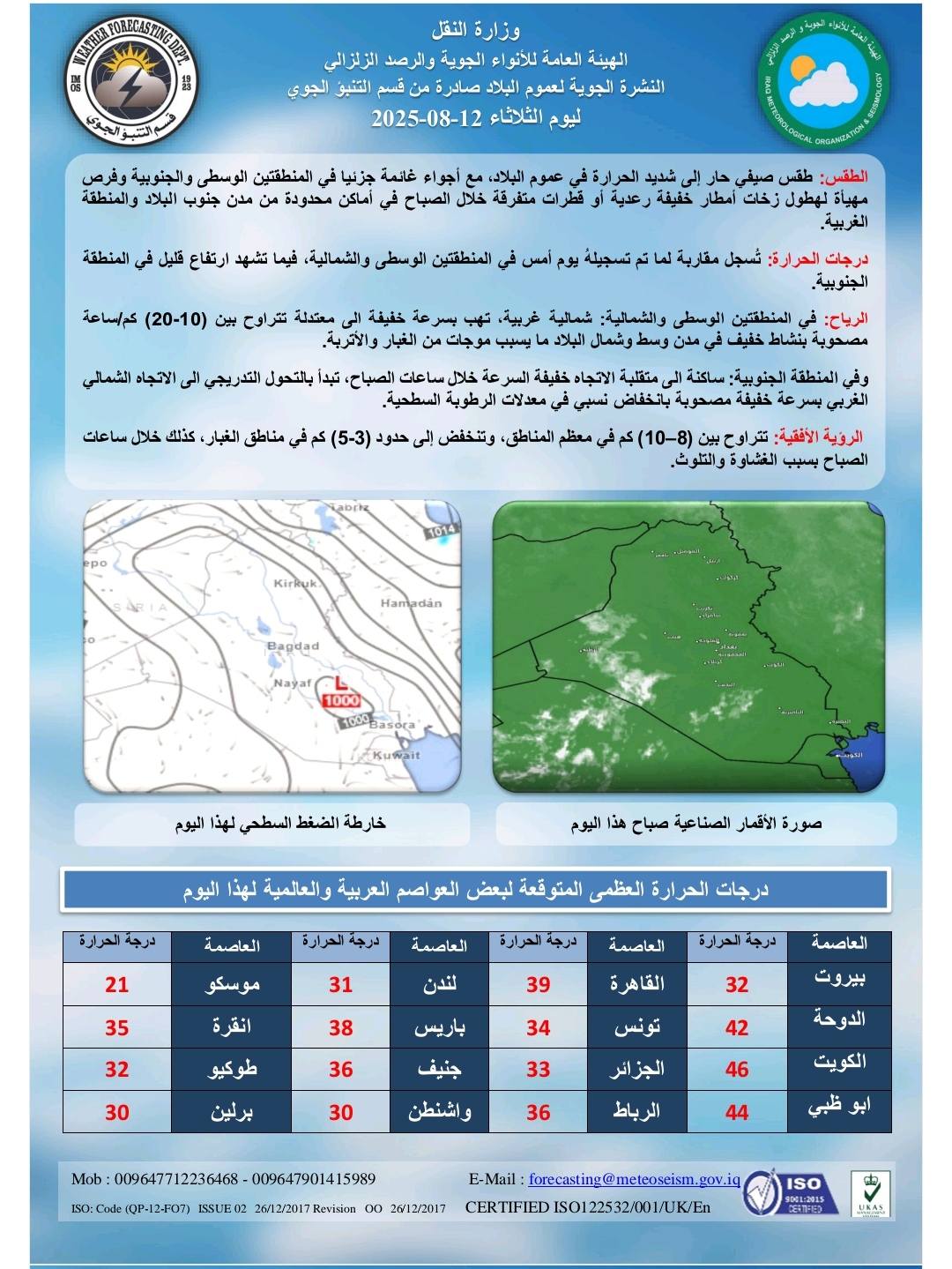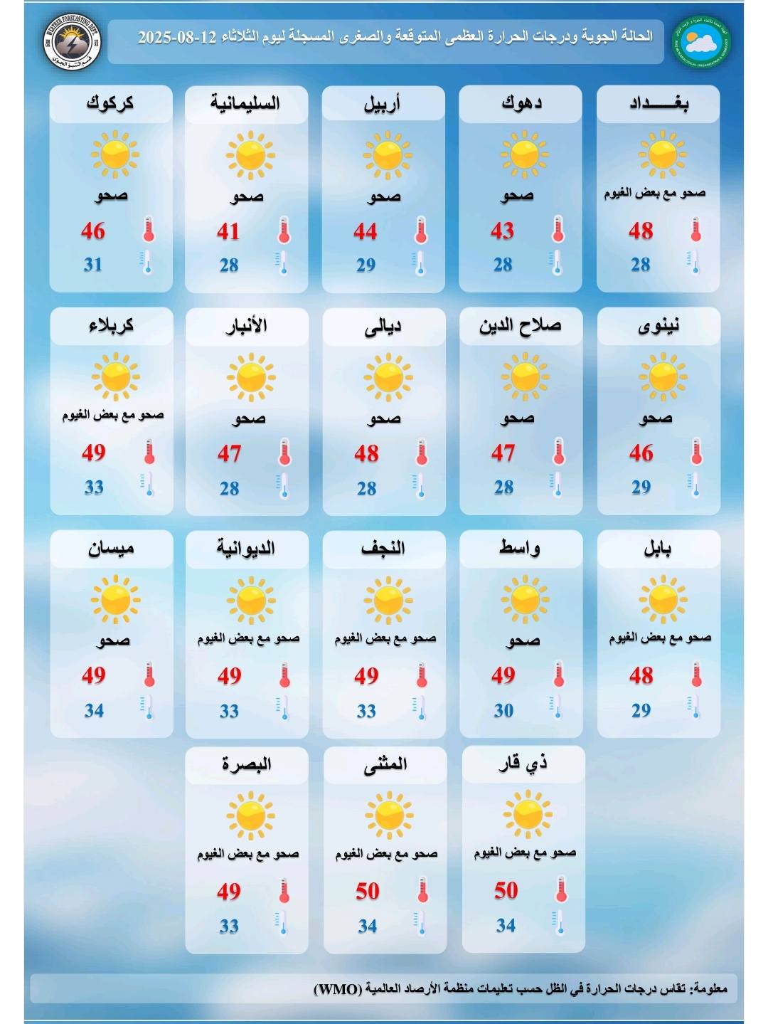 وذكر بيان للهيئة العامة للانواء الجوية والرصد الزلزالي قسم التنبؤ الجوي في بيان لها اليوم الثلاثاء 12 آب 2025، أن "غداً الأربعاء سيكون الطقس صحواً وحاراً مع ظهور بعض الغيوم في أماكن متفرقة من المنطقتين الوسطى والجنوبية، ودرجات الحرارة مقاربة لليوم السابق في عموم البلاد".