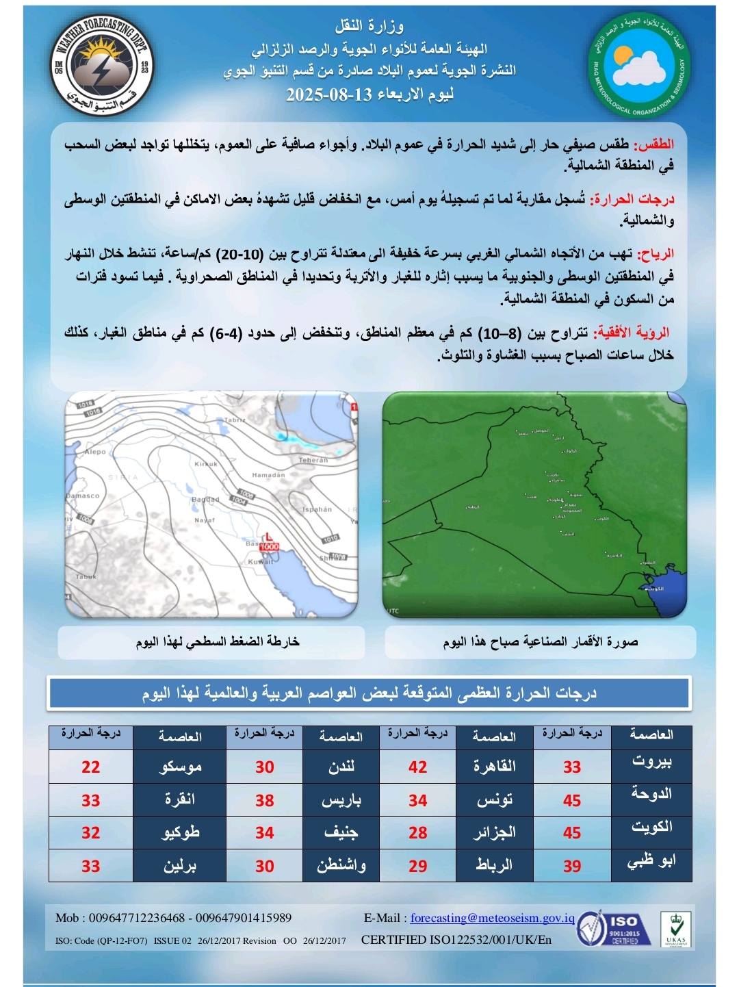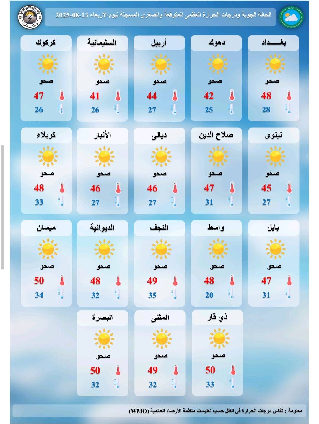 وذكر بيان للهيئة العامة للانواء الجوية والرصد الزلزالي قسم التنبؤ الجوي اليوم الاربعاء 13 آب 2025، أن "غداً الخميس سيكون الطقس صحواً وحاراً على العموم، والرياح شمالية غربية خفيفة الى معتدلة السرعة تنشط الى (30)كم بالساعة مسببة تصاعد الغبار، فيما سترتفع درجات الحرارة قليلاً في المنطقة الشمالية ومقاربة لليوم السابق في المنطقتين الوسطى والجنوبية"، مبيناً أن "درجات الحرارة العظمى في بغداد وصلاح الدين وبابل وكربلاء المقدسة وكركوك48، الديوانية والمثنى وواسط والنجف الأشرف 49، البصرة وميسان وذي قار 50، الأنبار وديالى 46 ، فيما ستكون درجات الحرارة في دهوك والسليمانية 43 ،أربيل 45 ،ونينوى 47".