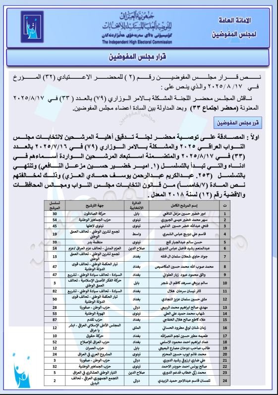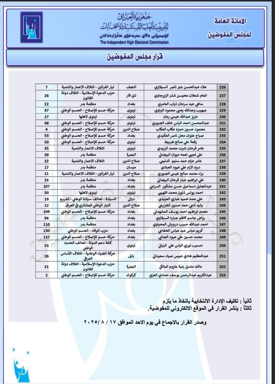 أربيل (كوردستان24)- نشرت المفوضية العليا المستقلة للانتخابات، اليوم الأحد 17 آب 2025، أسماء 253 مستبعدا من الانتخابات المقبلة، ضمنهم القاضي وائل عبداللطيف.