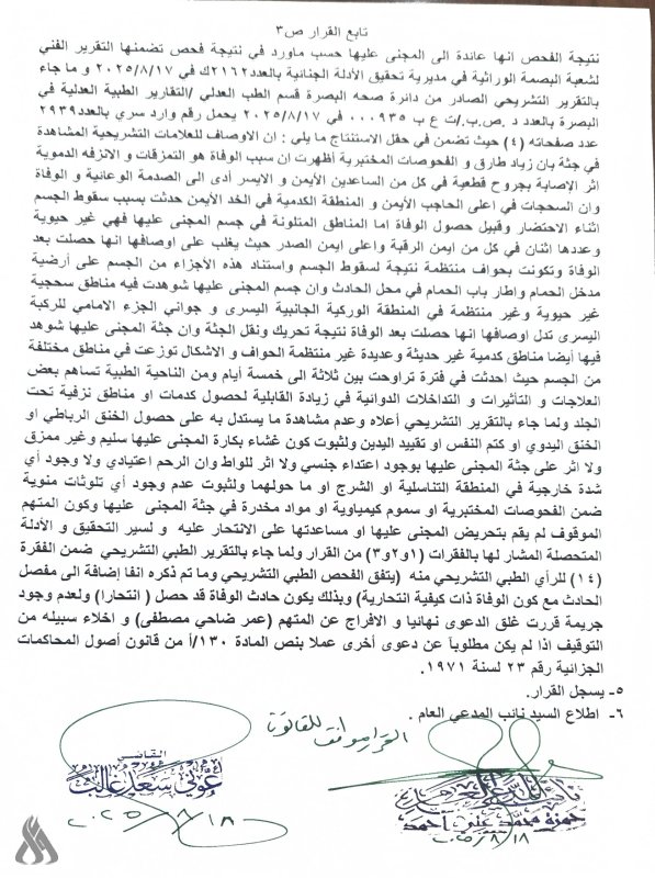 وأدناه وثائق نتائج التقرير الطبي الخاص بالطبيبة بان زياد بعد ثبوت أن الحادثة انتحار: