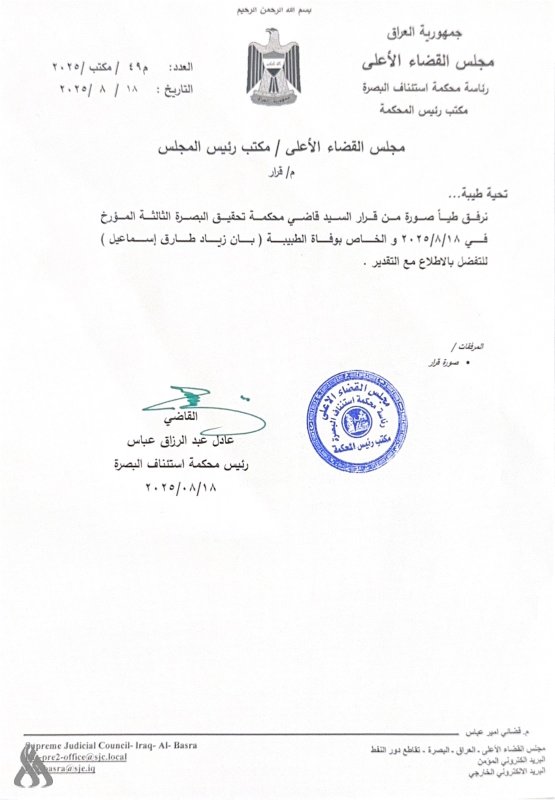 أربيل (كوردستان24)- أعلن القضاء الأعلى في العراق، أن رئاسة محكمة استئناف البصرة أرسلت إلى مكتب رئيس المجلس القرار الخاص بوفاة الطبيبة (بان زياد) الذي يتضح من خلال حيثيات القرار أن الحادث انتحار لذا تم غلق التحقيق.