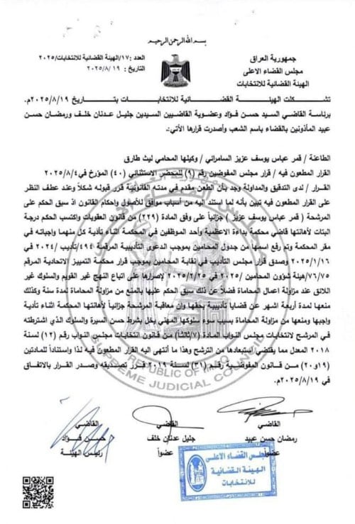 وثيقة.. مجلس القضاء يصادق على استبعاد قمر السامرائي من الانتخابات