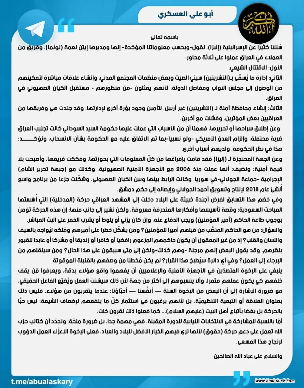 وأشار سالم إلى أن "الكتائب ومن لف لفهم هم صغار وهوامش في المعادلة الإقليمية لا قيمة لهم ويأتمرون بأمر الخارج ويخضعون لهم في قرارهم، وهؤلاء مجرد أداة لتمزيق النسيج المجتمعي العراقي".