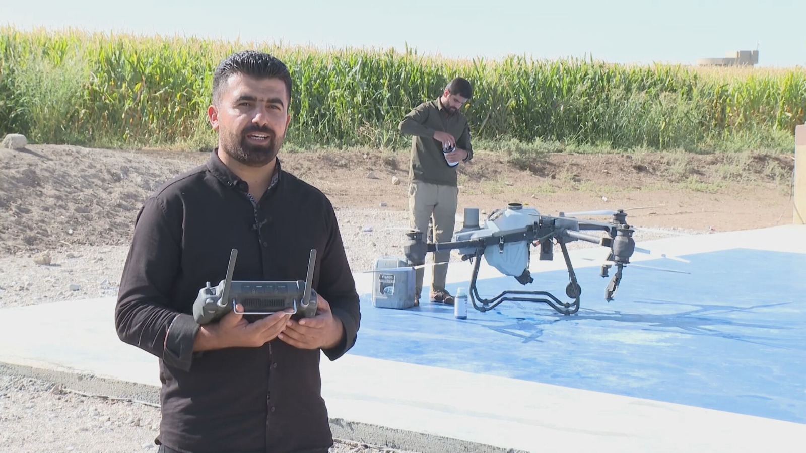 الشاب هيمن محمود، من ناحية روفيا، هو صاحب هذه المبادرة. منذ شهرين، استثمر في طائرة درون زراعية حديثة وبدأ بتقديم خدماته للمزارعين في المنطقة. يقول هيمن: "اسمي هيمن محمود، من ناحية روفيا في قضاء بردرش. منذ شهرين، أحضرت هذه الطائرة بدون طيار الزراعية إلى هذه المنطقة، ومهمتها هي رش المبيدات الكيماوية والأسمدة".