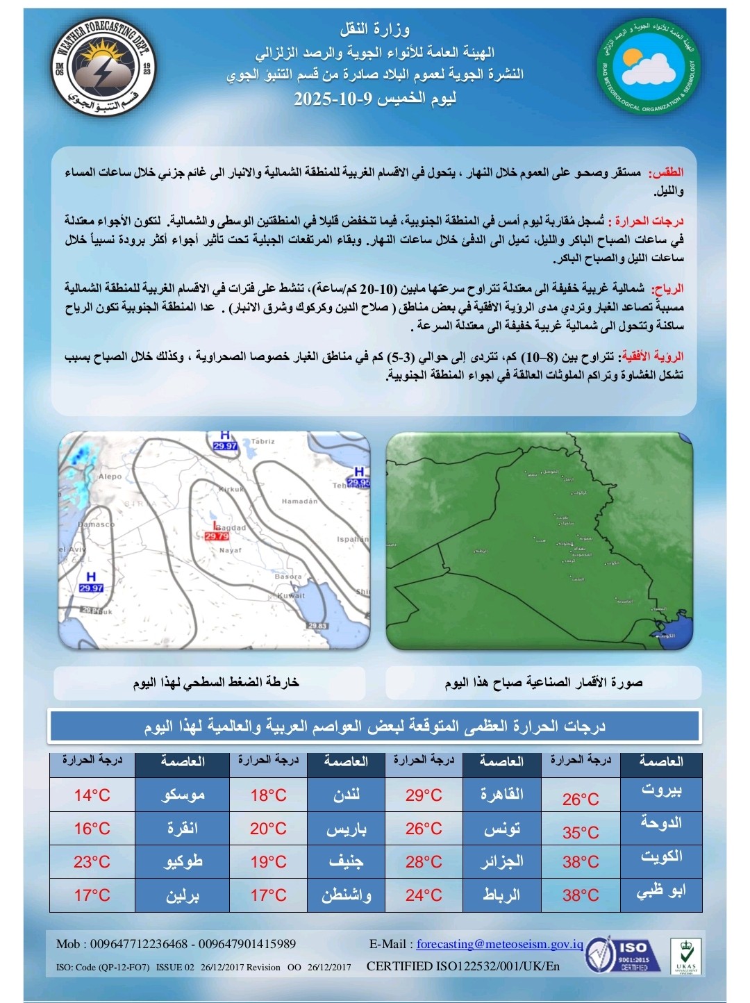 وذكر بيان للهيئة العامة للانواء الجوية والرصد الزلزالي قسم التنبؤ الجوي اليوم الخميس 9 اكتوبر 2025، أن "غداً الجمعة سيكون الطقس صحواً مع بعض الغيوم في المنطقة الشمالية، والرياح شمالية غربية خفيفة إلى معتدلة السرعة (10-20) كم/س تنشط في المنطقتين الوسطى والجنوبية (30-40) كم/س مُسببة تصاعد الغبار فيهما، ودرجات الحرارة تنخفض بضع درجات عن اليوم السابق، أما الرؤية الأفقية (6-8) كم وفي الغبار (3-5) كم".