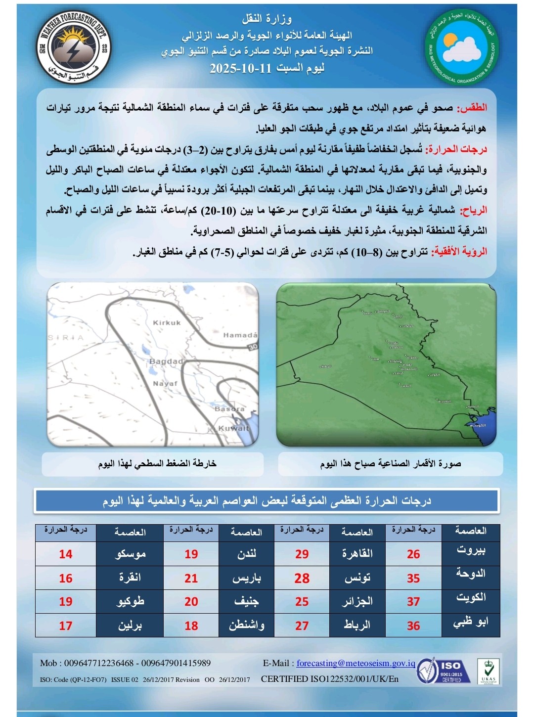 وذكر بيان للهيئة العامة للانواء الجوية والرصد الزلزالي قسم التنبؤ الجوي اليوم السبت 11 اكتوبر 2025، أن "غداً الأحد سيكون الطقس صحواً وغائماً جزئياً إلى غائم في المنطقة الشمالية مع تساقط أمطار خفيفة إلى متوسطة الشدة في بعض أقسامها خاصة الجبلية، ودرجات الحرارة ترتفع قليلاً في المنطقتين الوسطى والجنوبية ومقاربة في المنطقة الشمالية".