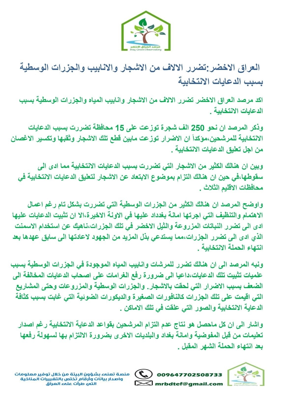 مرصد العراق الأخضر اختتم بيانه بالتأكيد على أن حماية المساحات الخضراء واجب وطني، داعياً المرشحين إلى جعل حملاتهم مثالاً للوعي والمسؤولية البيئية بدلاً من أن تكون سبباً في تشويه المدن وتخريب ما تبقى من مظاهر الجمال فيها.