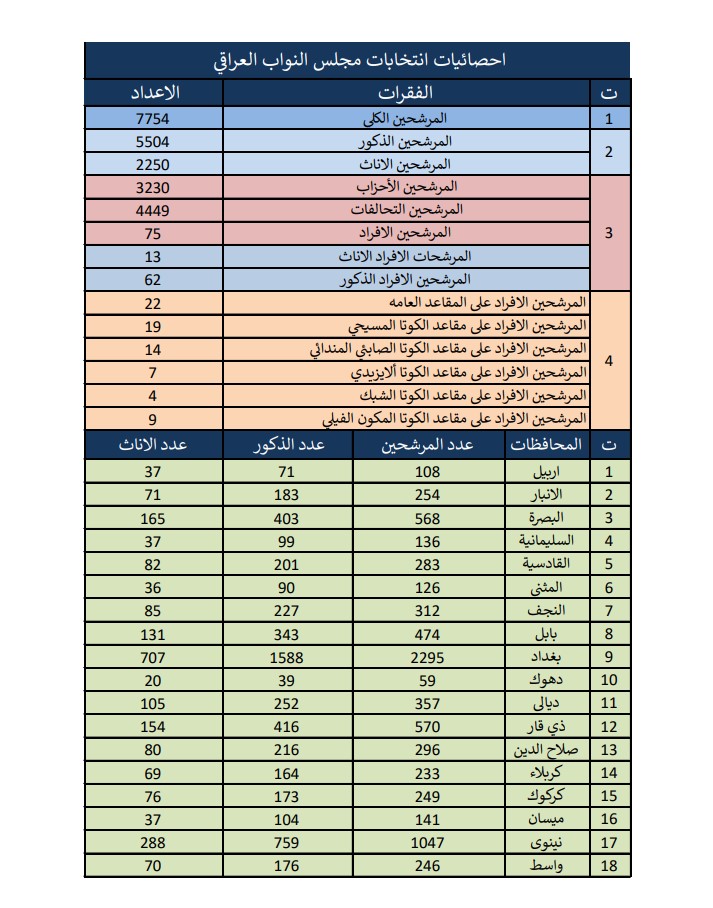 وتشير هذه الإحصائيات إلى خريطة انتخابية متنوعة وديناميكية، تعكس التنافس الشديد بين القوى السياسية المختلفة وتفاوت ثقلها الانتخابي في المحافظات العراقية.