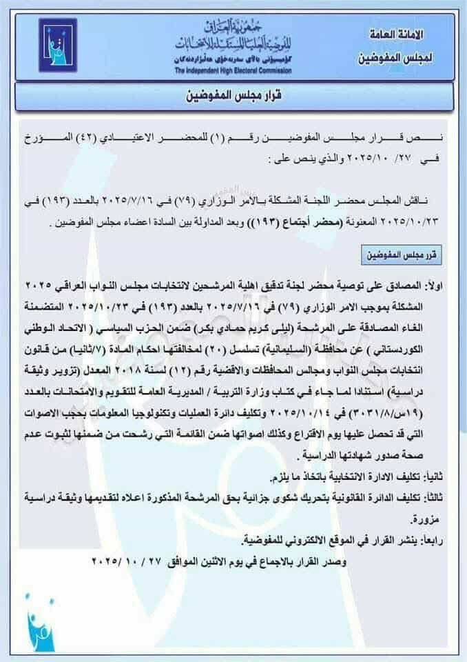 وقرر المجلس، "المصادقة على استبعاد المرشحة ليلى كريم حمادي بكر عن الاتحاد الوطني الكوردستاني؛ لمخالفتها أحكام المادة 7/ثانياً، لتزويرها وثيقة دراسية، بالإضافة إلى إلغاء المصادقة على ترشيح إياد محمود التميمي، والمرشح محمد عطية عطيوي، لمخالفتهما المادة 7/ سادساً من قانون انتخابات مجلس النواب".