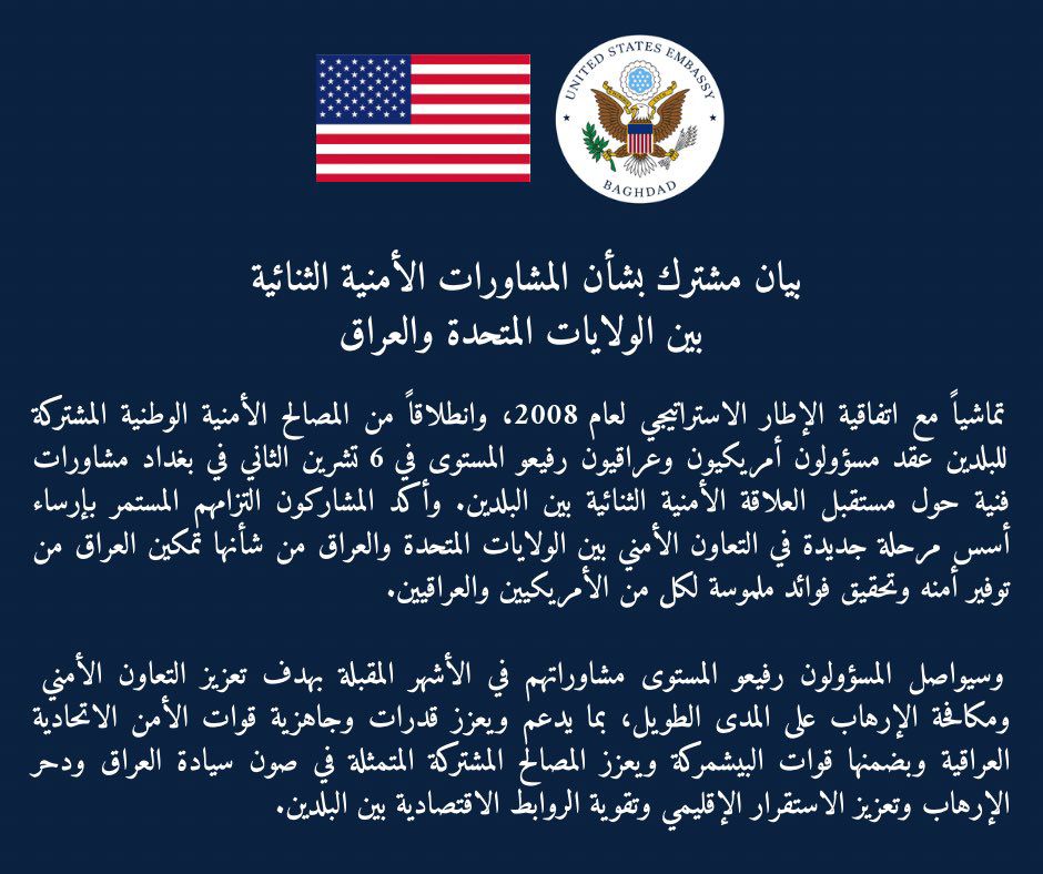 أربيل (كوردستان 24)- أعلنت السفارة الأميركية في بغداد عن عقد مشاورات فنية رفيعة المستوى بين العراق والولايات المتحدة، حول مستقبل العلاقة الأمنية الثنائية بين البلدين.
