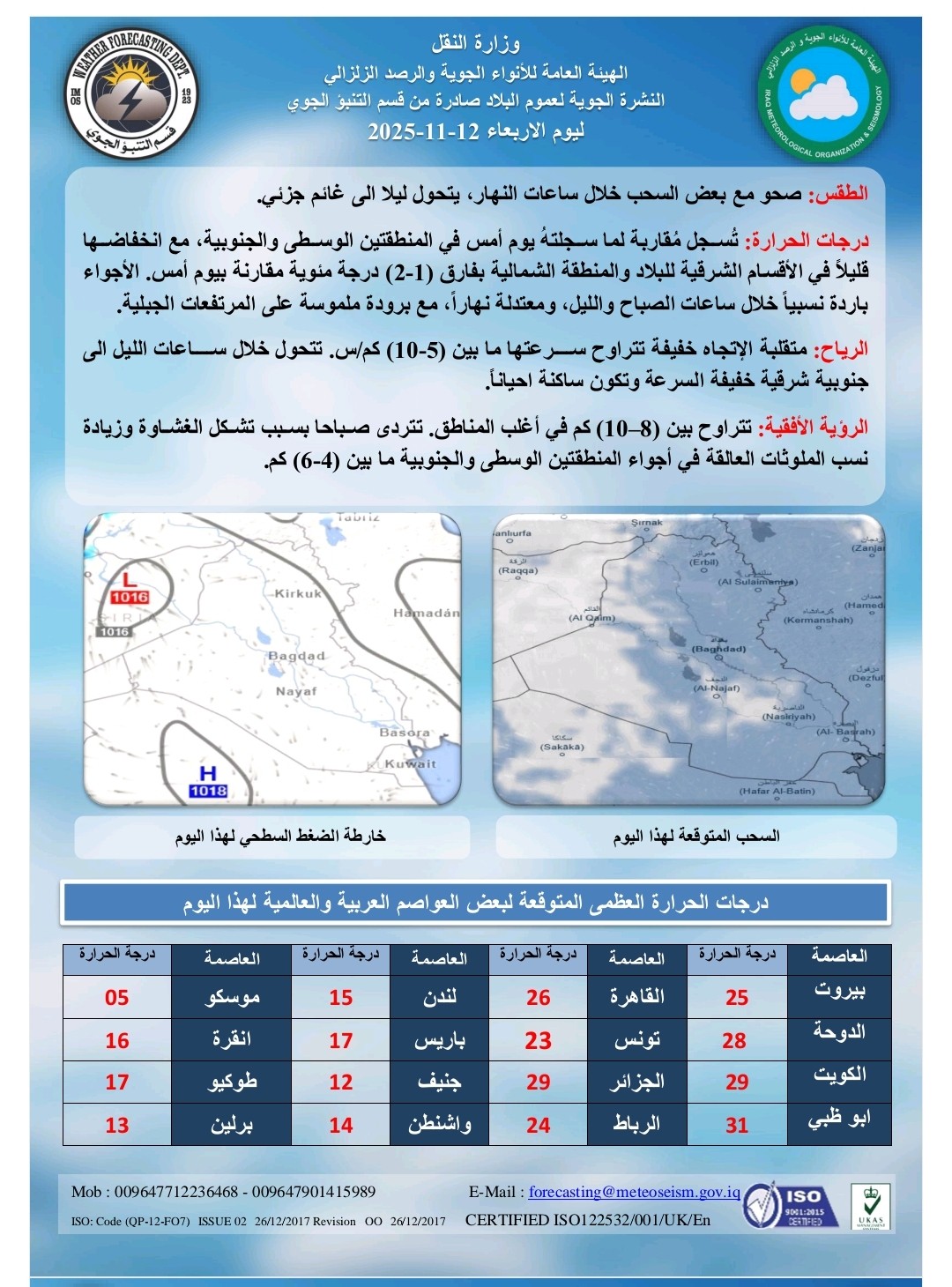وذكر بيان للهيئة العامة للانواء الجوية والرصد الزلزالي قسم التنبؤ الجوي اليوم الاربعاء 12 تشرين الثاني 2025، أن "غداً الخميس سيكون الطقس غائماً جزئيا واحياناً غائم، ودرجات الحرارة مقاربة لليوم السابق في عموم البلاد"، مبيناً أن "درجات الحرارة العظمى ليوم غدٍ في بغداد وكربلاء المقدسة وبابل 29، وديالى وصلاح الدين وواسط 28، وميسان والنجف الأشرف والديوانية والمثنى30، ودهوك 26 والسليمانية 24 وأربيل ونينوى وكركوك والأنبار27، والبصرة وذي قار 31".