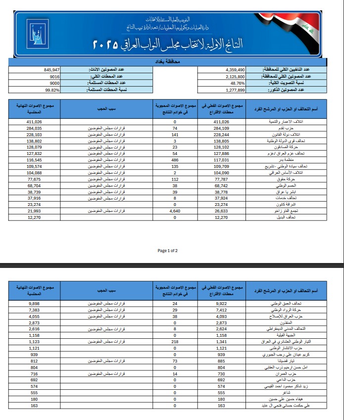 المفوضية تعلن نتائج انتخابات مجلس النواب العراقي