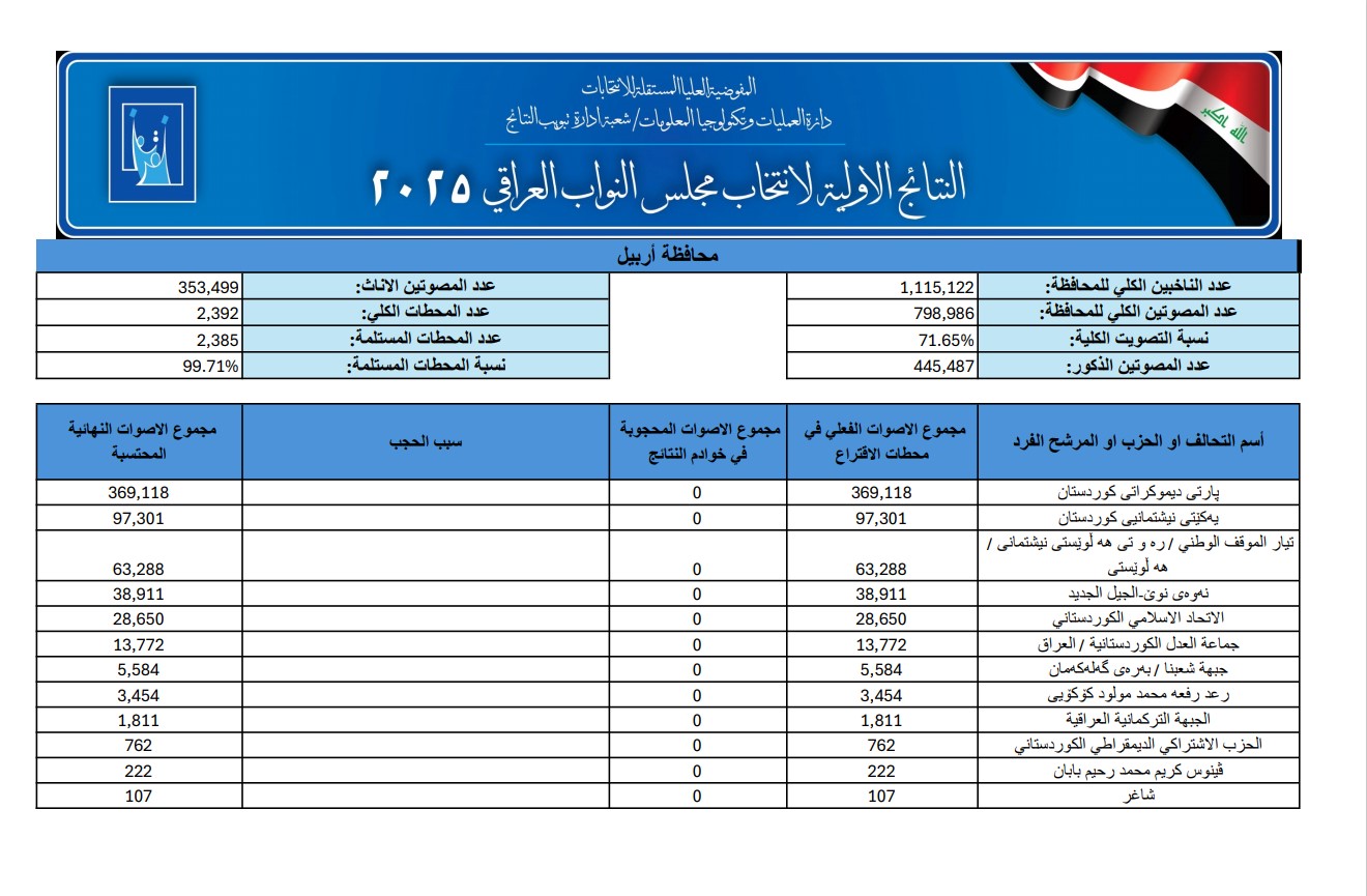 ووفقًا للبيانات، بلغ عدد الناخبين الكلي في أربيل 1,115,122 ناخبًا، فيما شارك في التصويت 798,986 ناخبًا بنسبة مشاركة بلغت 71.65%، وهو من أعلى معدلات المشاركة على مستوى العراق.