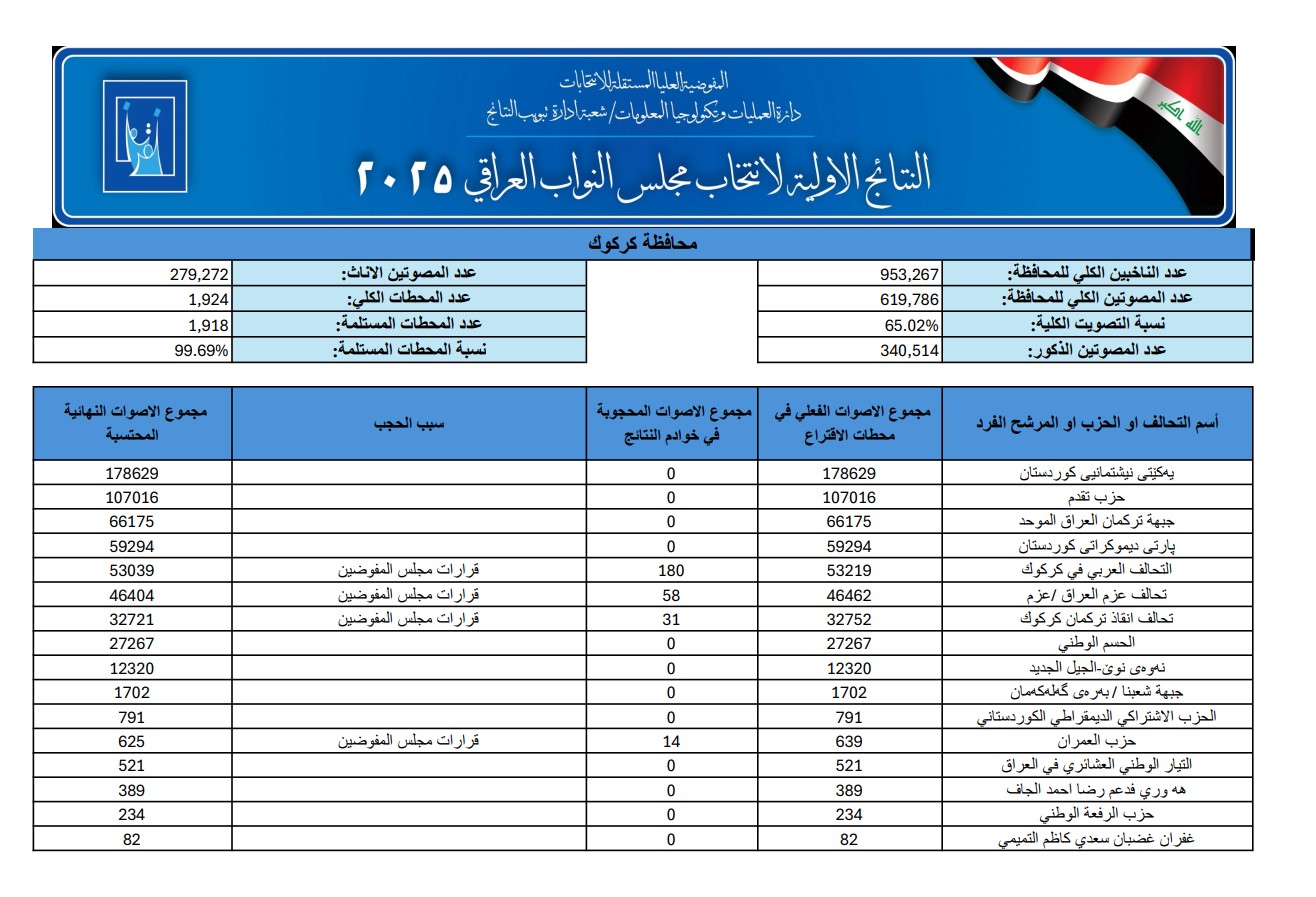 وبحسب البيانات الرسمية الصادرة عن المفوضية، بلغ عدد المصوّتين في كركوك 619,789 ناخبًا من أصل 953,267 ناخبًا مسجلًا، بنسبة مشاركة وصلت إلى 65.02%.