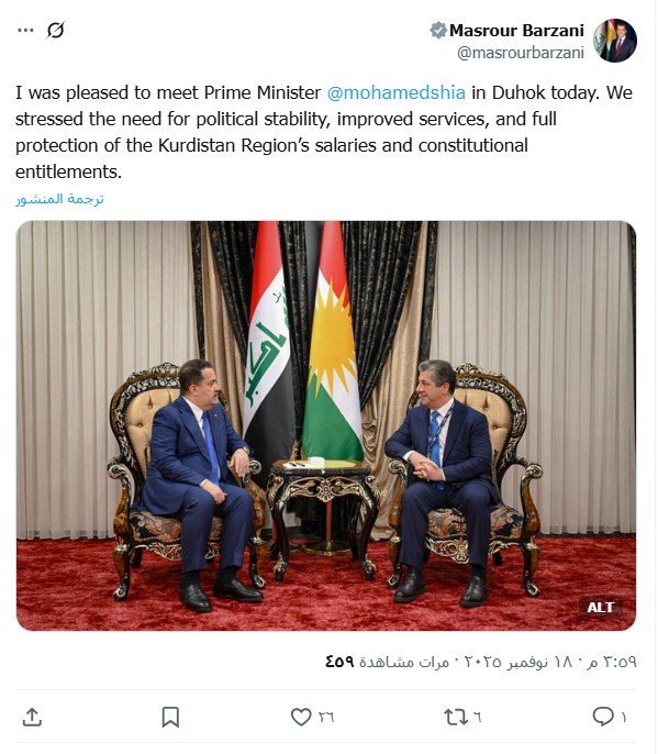 وقال مسرور بارزاني عبر منشورٍ على منصة إكس: التقينا بالسيد محمد شياع السوداني رئيس الوزراء الاتحادي، وأكدنا على ضرورة تأمين مستحقات إقليم كوردستان المالية.