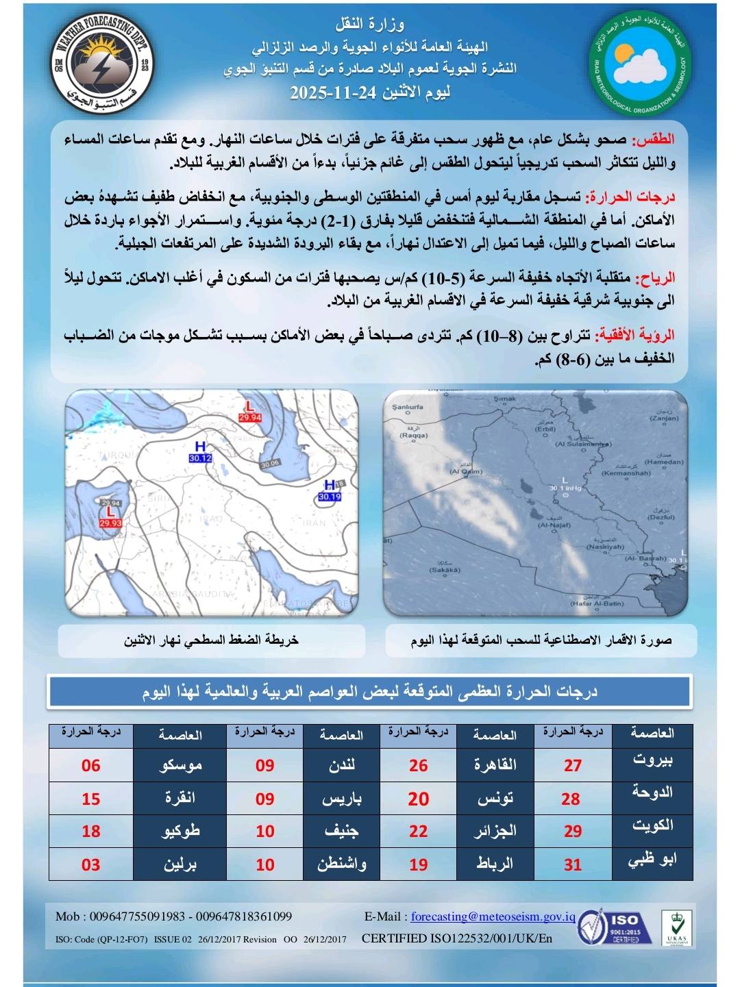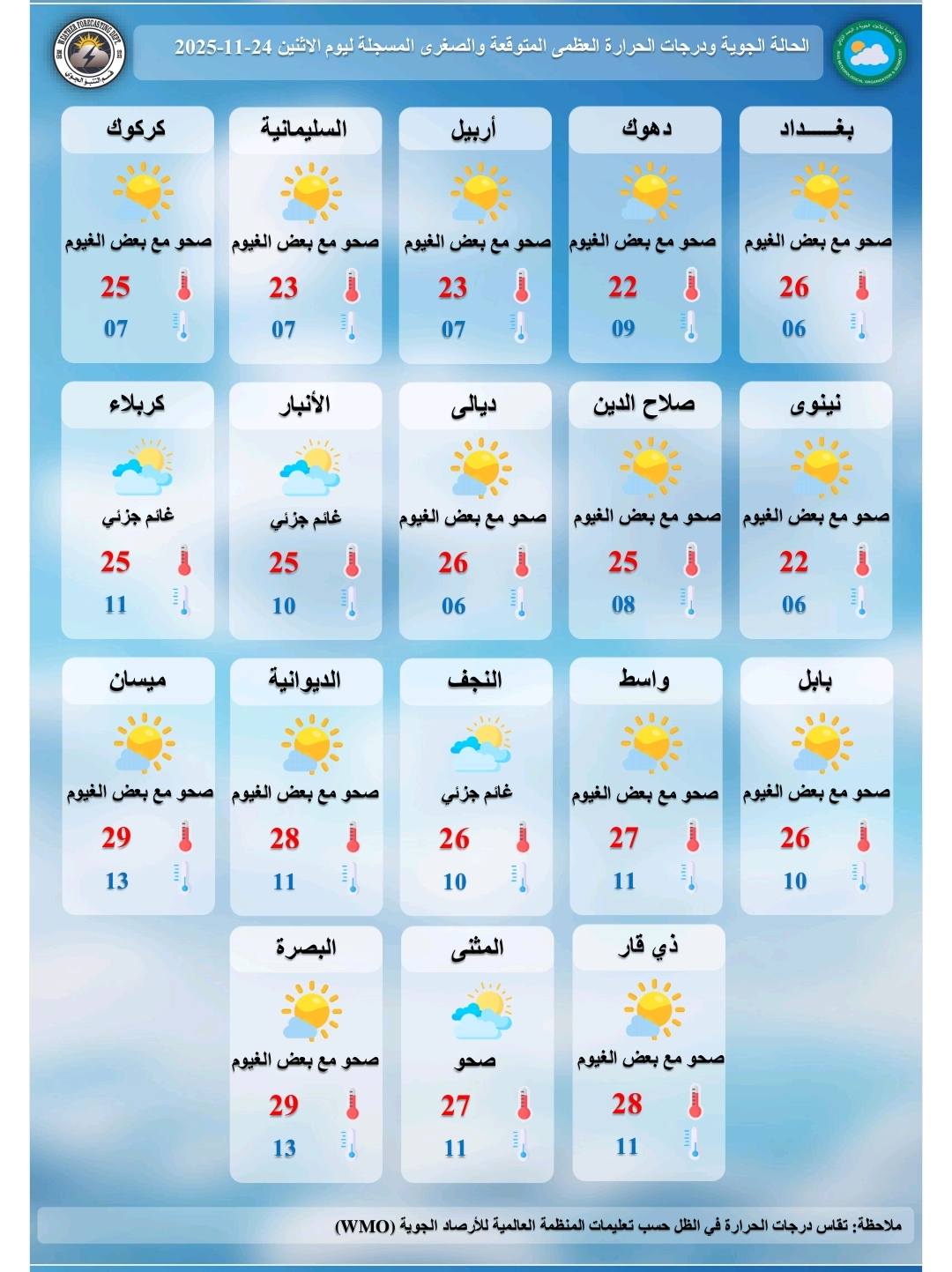 وذكر بيان للهيئة العامة للانواء الجوية والرصد الزلزالي قسم التنبؤ الجوي اليوم الاثنين 24 تشرين الثاني 2025، أن "غداً الثلاثاء سيكون الطقس غائماً مع فرصة لتساقط زخات مطر خفيفة الشدة في الأجزاء الغربية من المنطقة الوسطى، ودرجات الحرارة مقاربة في المنطقتين الوسطى والجنوبية وتنخفض قليلاً في المنطقة الشمالية".