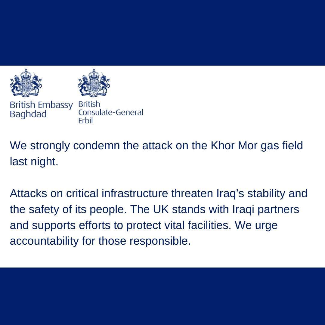 وقال السفير البريطاني عرفان صديق: "إن الاعتداءات على البنية التحتية الحيوية تهدد استقرار العراق وسلامة شعبه، مضيفاً: "تقف المملكة المتحدة مع الشركاء العراقيين وتدعم الجهود الرامية إلى حماية المنشآت الحيوية. نحث على محاسبة المسؤولين عن هذا الهجوم".