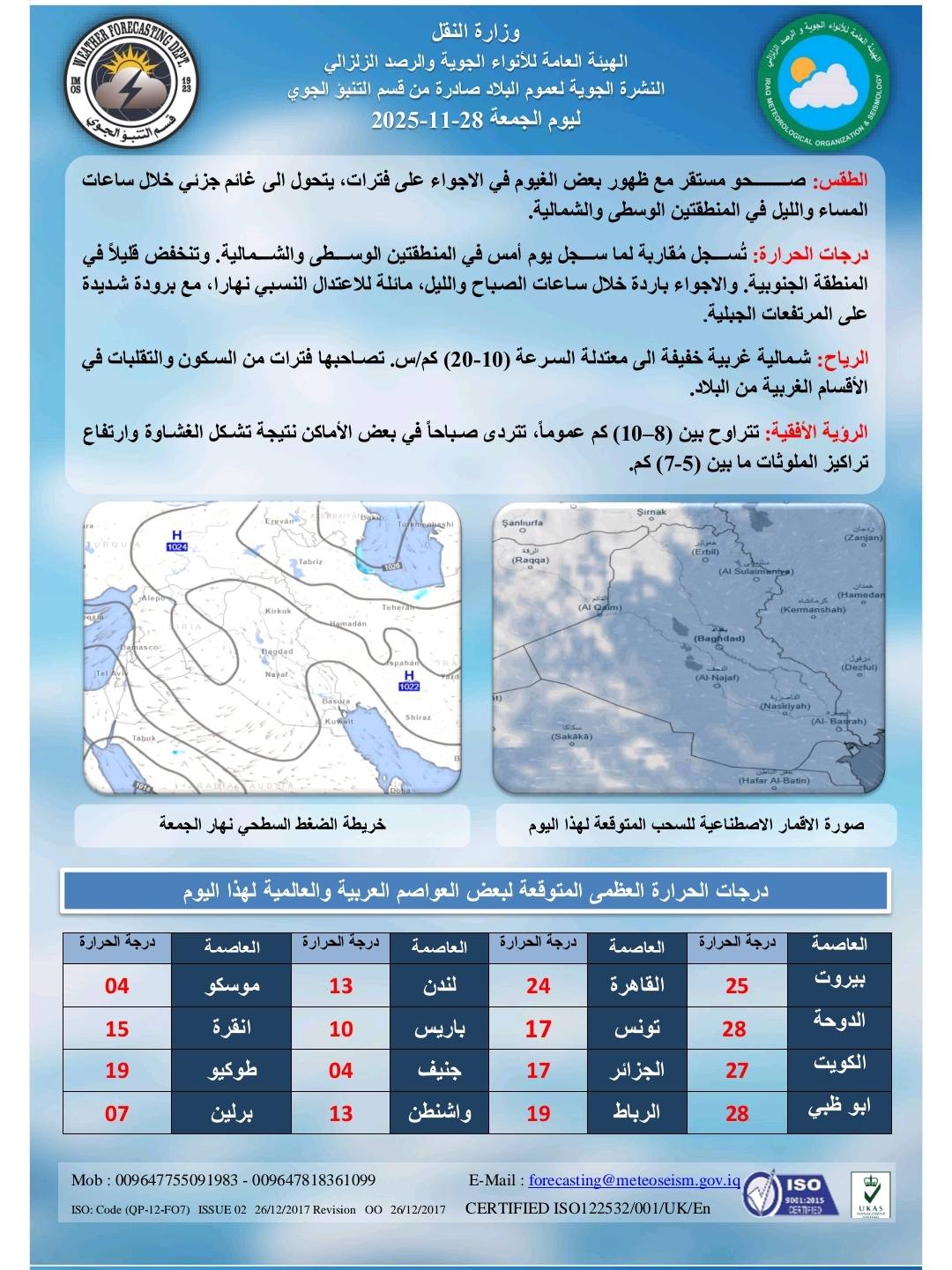 وذكر بيان للهيئة العامة للانواء الجوية والرصد الزلزالي قسم التنبؤ الجوي اليوم الجمعة 28 تشرين الثاني 2025، أن "غداً السبت سيكون الطقس غائماً جزئياً ودرجات الحرارة مقاربة لليوم السابق في عموم البلاد، مبيناً أن "درجات الحرارة العظمى ليوم غدٍ في دهوك 15 والسليمانية 17 وأربيل 20، ونينوى 21، والأنبار 22، وكركوك وصلاح الدين 23، وبغداد وديالى والنجف الأشرف 24، وكربلاء المقدسة وواسط والديوانية 25، وبابل وميسان وذي قار والمثنى 26، والبصرة 27".