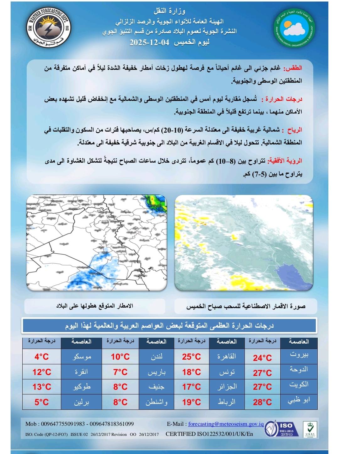 وذكر بيان للهيئة العامة للانواء الجوية والرصد الزلزالي قسم التنبؤ الجوي اليوم الخميس 4 كانون الاول 2025، أن "غداً الجمعة سيكون الطقس غائماً جزئياً وأحياناً غائم على العموم مع فرصة لتساقط زخات مطر خفيفة في المنطقة الجنوبية وفي الأقسام الشرقية من المنطقة الوسطى، ودرجات الحرارة ترتفع قليلاً في المنطقتين الوسطى والجنوبية ومقاربة في المنطقة الشمالية".