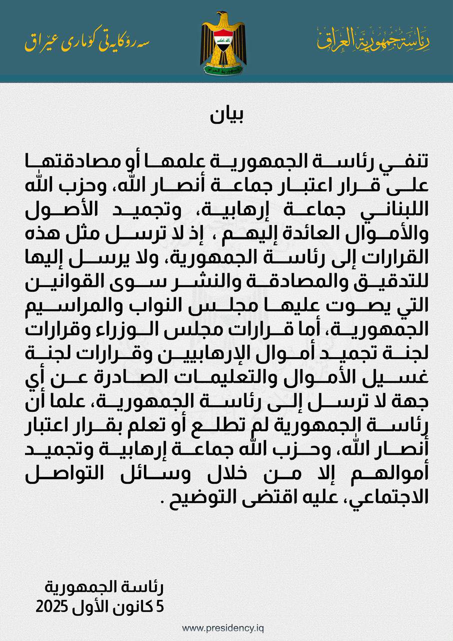 أربيل (كوردستان24)- نفت رئاسة الجمهورية العراقية اليوم الجمعة 5 كانون الاول 2025، علمها أو مصادقتها على القرار القاضي باعتبار جماعة "أنصار الله" و"حزب الله" اللبناني جماعات إرهابية، وما يترتب عليه من تجميد للأصول والأموال العائدة لهما.