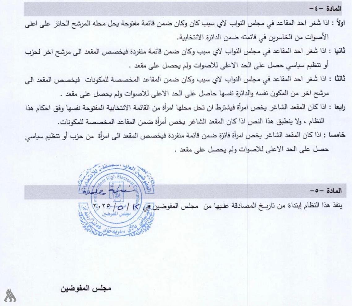ونشرت مفوضية الانتخابات المادة الرابعة من قرار مجلس المفوضين الخاص بشغر أحد مقاعد البرلمان.