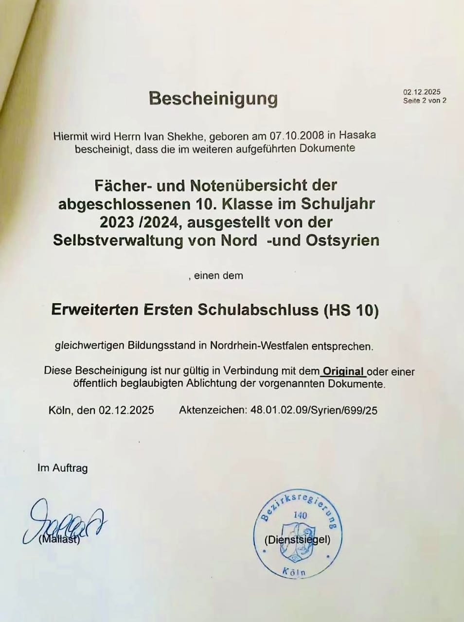 وبحسب الوثيقة، فقد تم التصديق للطالب "إيفان شيخي"، المولود في الحسكة عام 2008، بأن شهادته المدرسية لإتمام الصف العاشر للعام الدراسي 2023/2024، والصادرة عن "الإدارة الذاتية لشمال وشرق سوريا"، تُعادل رسمياً المستوى التعليمي الألماني المعروف بـ (Erweiterten Ersten Schulabschluss - HS 10)، وهي شهادة إتمام المرحلة الثانوية الأولى في ولاية شمال الراين-وستفاليا.