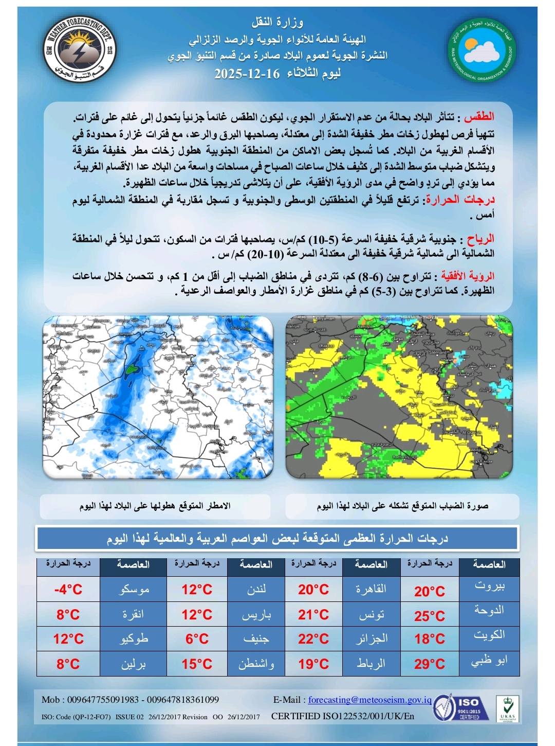 وذكر بيان للهيئة العامة للانواء الجوية والرصد الزلزالي قسم التنبؤ الجوي اليوم الثلاثاء 16 كانون الاول 2025، أن "غداً الأربعاء سيكون الطقس غائماً على العموم مع تساقط أمطار خفيفة إلى متوسطة الشدة في المنطقتين الوسطى والجنوبية تكون رعدية أحياناً، ويتشكل ضباب متوسط صباحاً ويزول تدريجياً، ودرجات الحرارة ترتفع قليلاً في المنطقة الشمالية وتنخفض قليلاً في المنطقتين الوسطى والجنوبية، والرؤية الأفقية (6–8) كم وفي المطر والضباب (2–4) كم".
