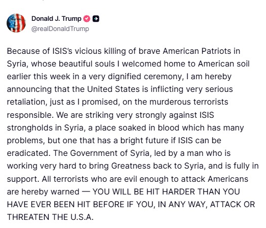 وعبر منصته "تروث سوشيال"، أعلن ترمب عن انطلاق العملية الواسعة، قائلاً: "نوجه ضربات قوية جداً ضد معاقل تنظيم الدولة الإسلامية في سوريا"، وذلك بالتزامن مع إعلان البنتاغون عن إطلاق عملية عسكرية شاملة للقضاء على قدرات التنظيم في المنطقة.