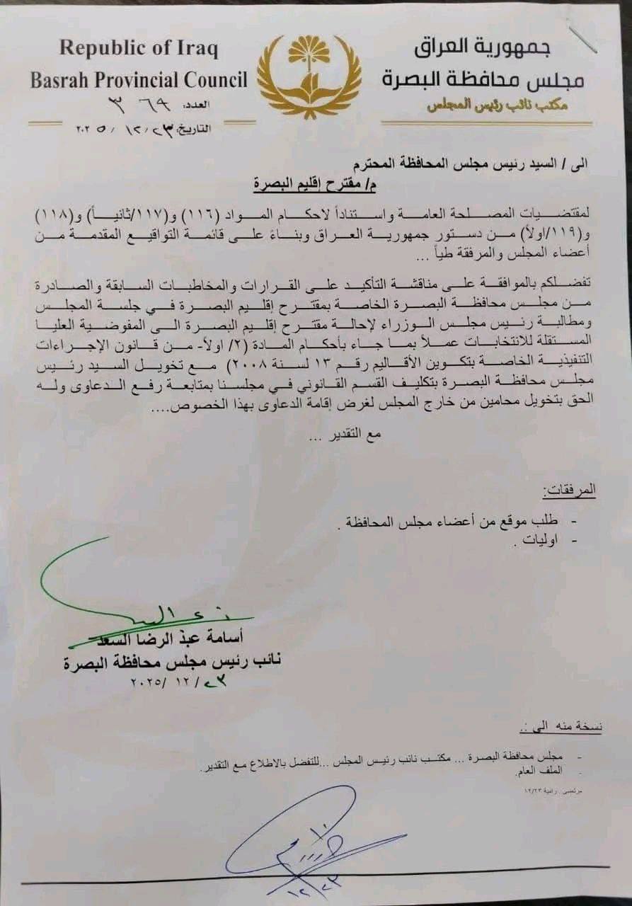 ووقع الكتاب نائب رئيس مجلس محافظة البصرة أسامة عبد الرضا السعد، مرفقاً بطلب موقع من أعضاء المجلس وأوليات رسمية تؤكد استكمال الإجراءات القانونية المطلوبة.