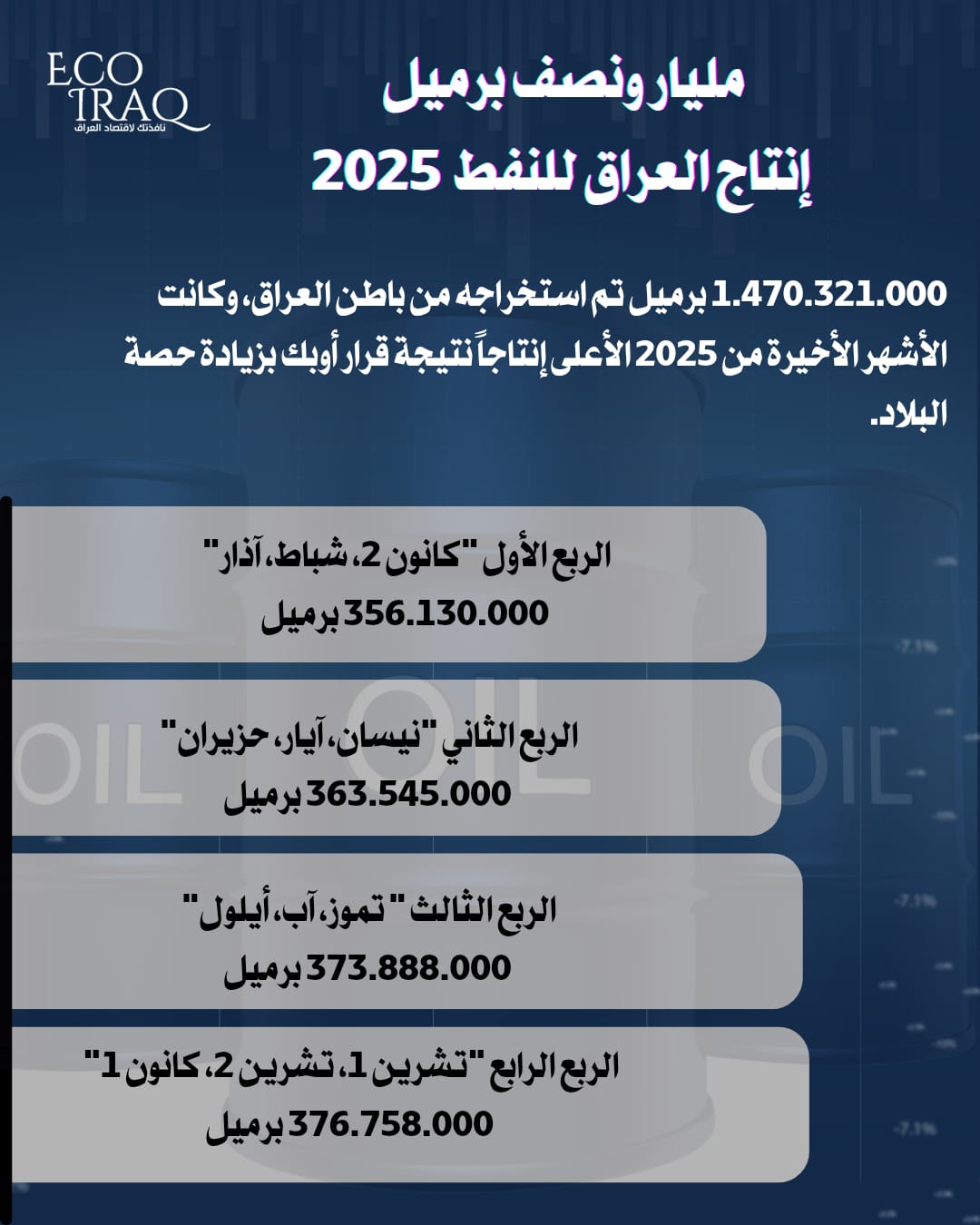 وقال المرصد في بيان صحفي: "تم استخراج نحو 1,470,321,000 برميل من باطن أرض العراق خلال العام الحالي"، مبيناً أن "الأشهر الأخيرة من 2025 كانت الأعلى إنتاجاً نتيجة قرار أوبك بزيادة حصة البلاد".