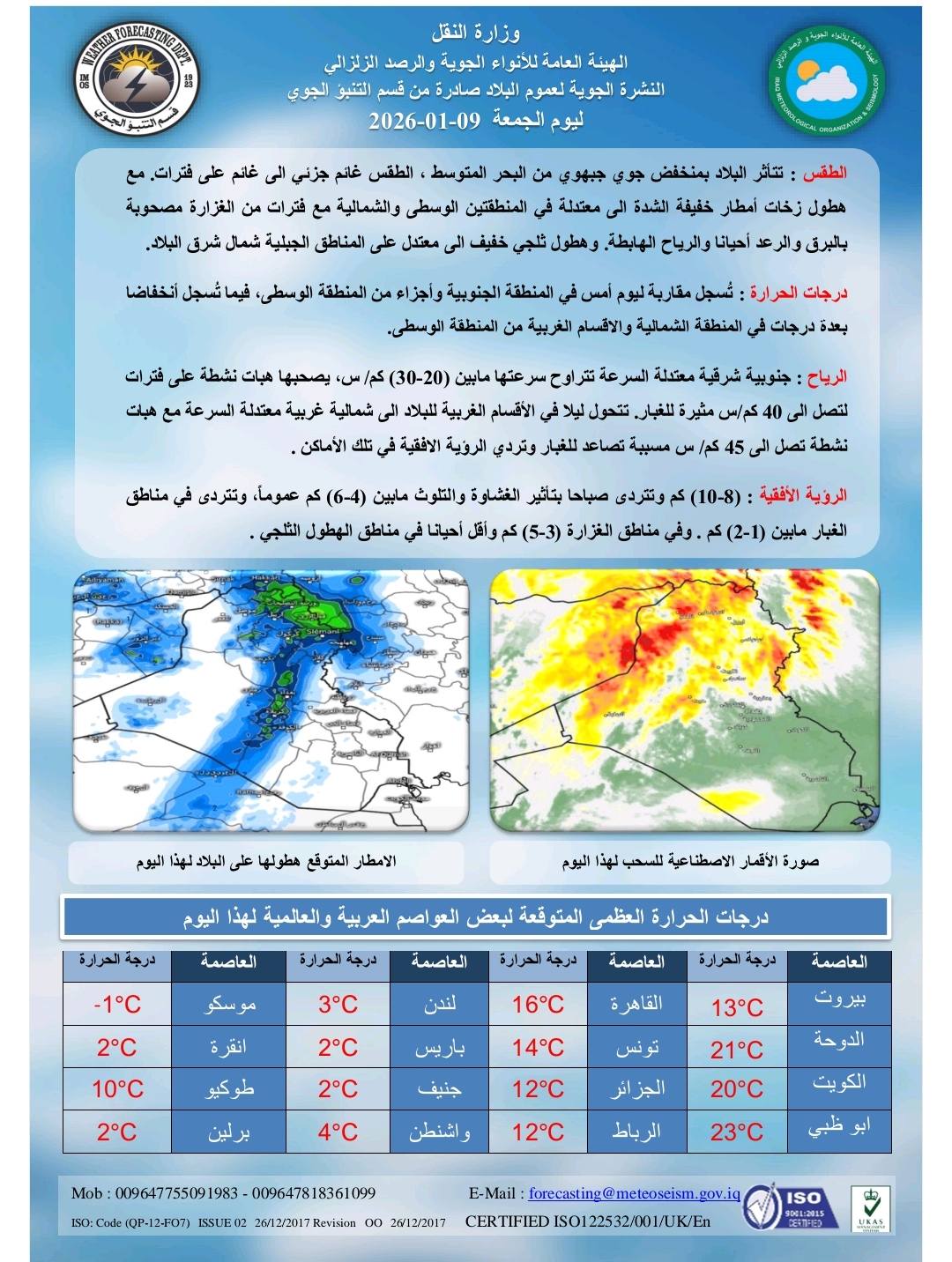 وذكر بيان للهيئة العامة للانواء الجوية والرصد الزلزالي قسم التنبؤ الجوي اليوم الجمعة 9 كانون الثاني 2025، أن "غداً السبت سيكون الطقس غائماً جزئياً، ويكون غائماً أحياناً مع تساقط أمطار خفيفة الى متوسطة الشدة في الأقسام الشرقية من البلاد وتكون رعدية، ويتحسن بعد الظهر تدريجياً، أما الرياح فشمالية غربية معتدلة السرعة (20-30) كم/س، تنشط نهاراً الى (30-40) كم/س مسببة تصاعد الغبار، ودرجات الحرارة ستنخفض قليلاً في عموم البلاد"، مبيناً أن "درجات الحرارة العظمى ليوم غدٍ في بغداد وكربلاء المقدسة والديوانية وميسان والمثنى 16 وديالى والأنبار 15 وواسط وصلاح الدين 14 ودهوك 8 واربيل والسليمانية 10، أما في كركوك ونينوى 11 وبابل والنجف الأشرف وذي قار 17 والبصرة 18".