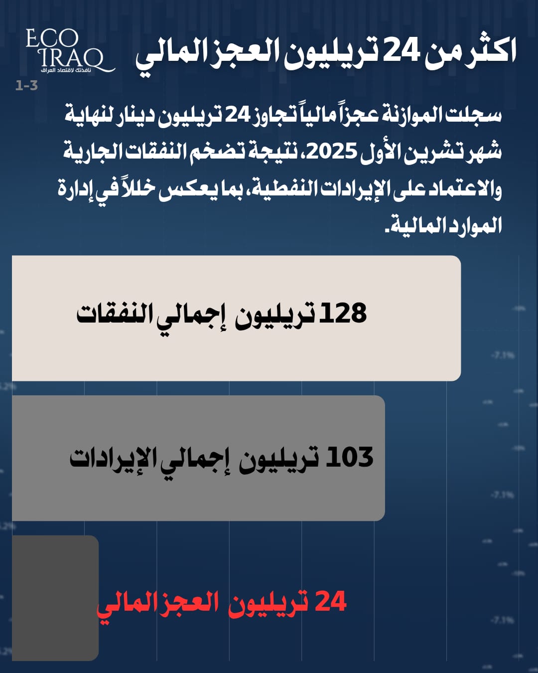 مرصد إيكو عراق: العجز المالي يصل إلى 24 تريليوناً و680 مليار دينار حتى تشرين الأول