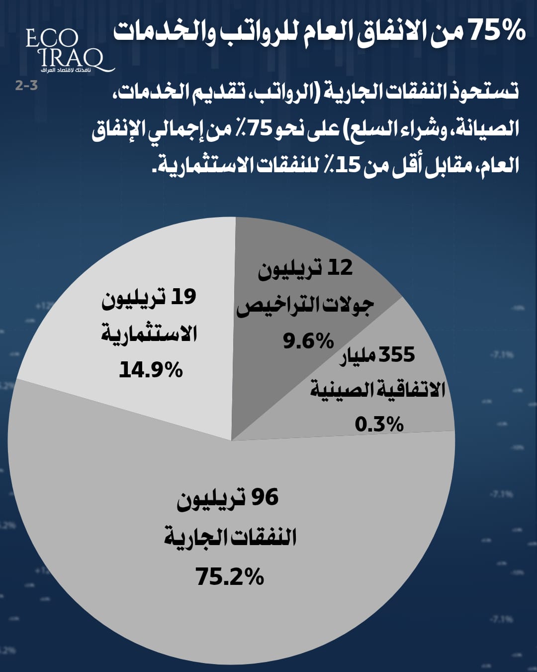 أربيل (كوردستان 24)- أعلن مرصد إيكو عراق أن العجز المالي لغاية شهر تشرين الأول الماضي بلغ 24 تريليوناً و680 مليار دينار، فيما أشار إلى أن النفقات الجارية، مثل الرواتب وتقديم الخدمات، تشكل 75% من الإنفاق العام.