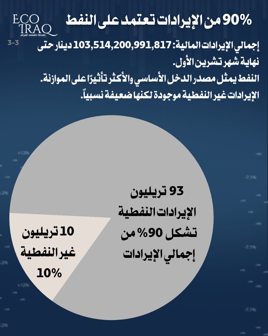 وأوضح إيكو عراق أن "الإيرادات المالية نحو 103 تريليون دينار، منها الإيرادات غير النفطية التي لم تتجاوز 10 تريليون".