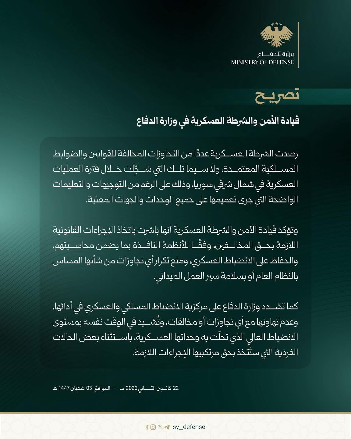 وأصدرت قيادة الشرطة العسكرية والأمن التابعة لوزارة الدفاع السورية، اليوم الخميس 22 كانون الثاني 2026، بياناً أقرت فيه بأن عدداً من العسكريين والوحدات التابعة لها في مناطق شمال شرقي سوريا قد انتهكوا القوانين والأنظمة العسكرية المعمول بها.