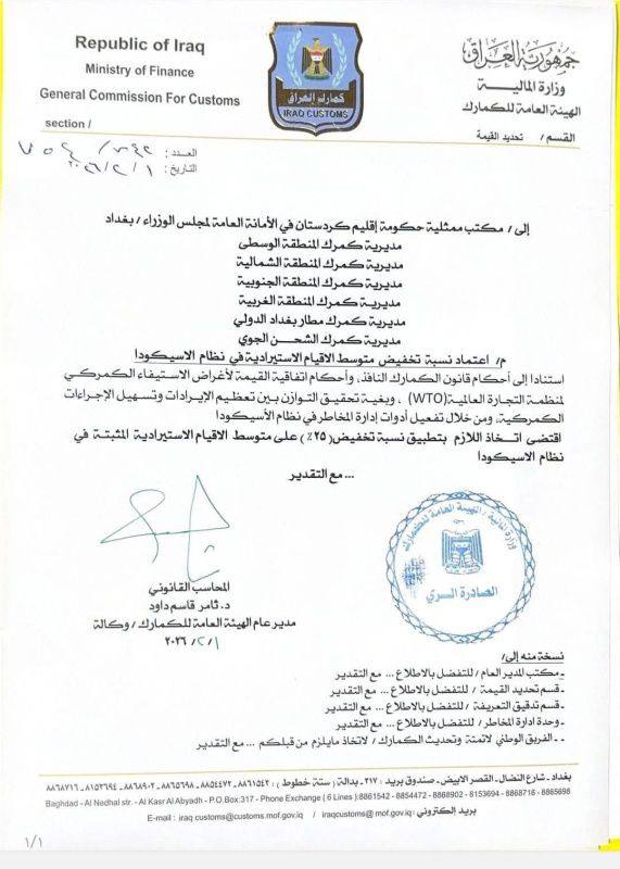 أربيل (كوردستان24)- أصدرت الهيئة العامة للجمارك في وزارة المالية، يوم الأحد، توجيهاً باعتماد نسبة تخفيض مقدارها 25% على متوسط القيم الاستيرادية المثبتة في نظام "الأسيكودا".