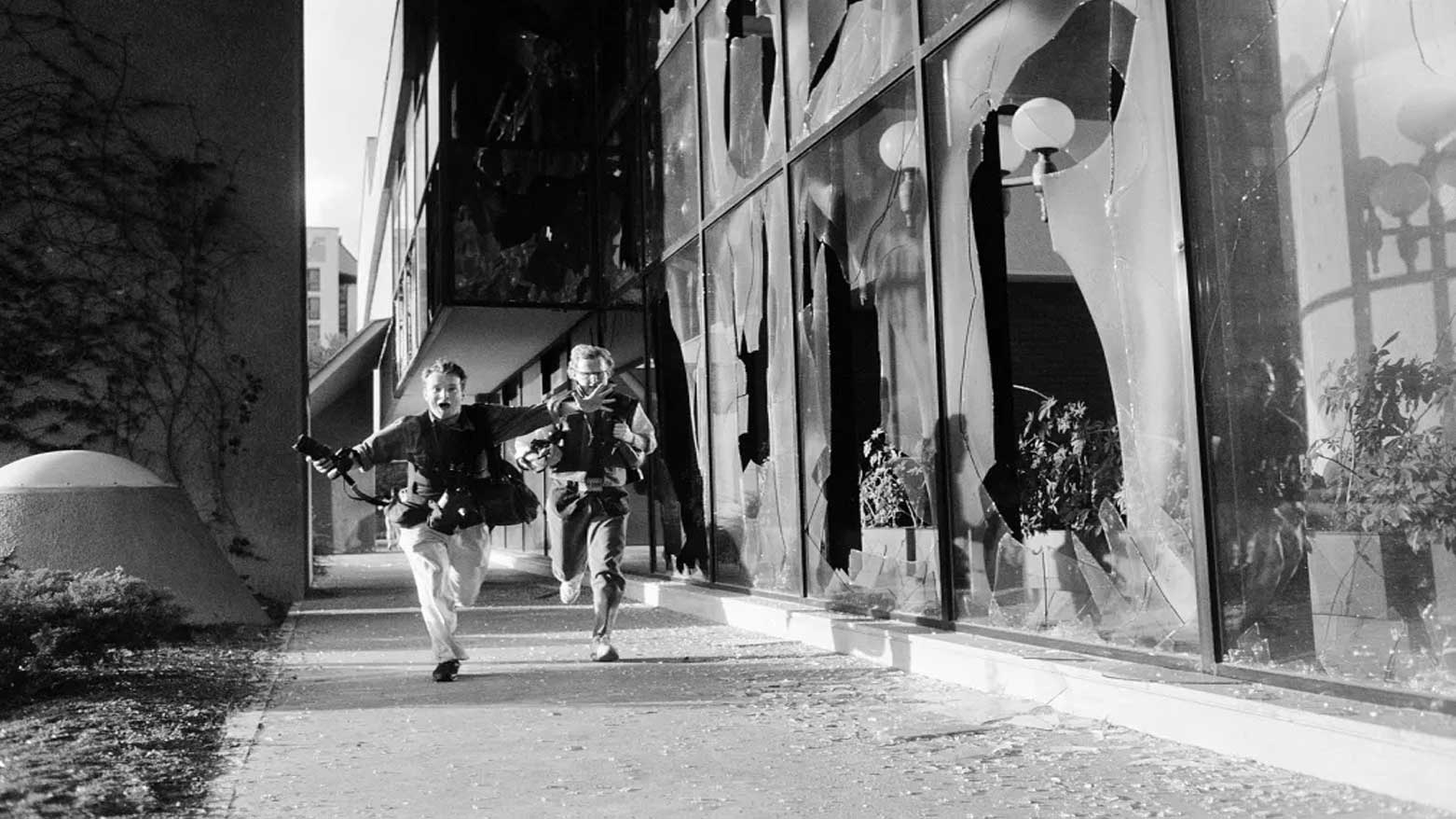 المصوران بول لوي وديفيد تيرنلي يركضان للاحتماء بجوار فندق "هوليداي إن عام 1992